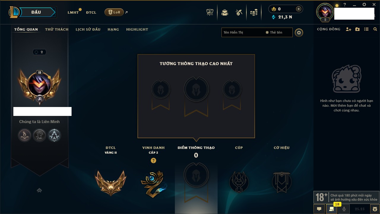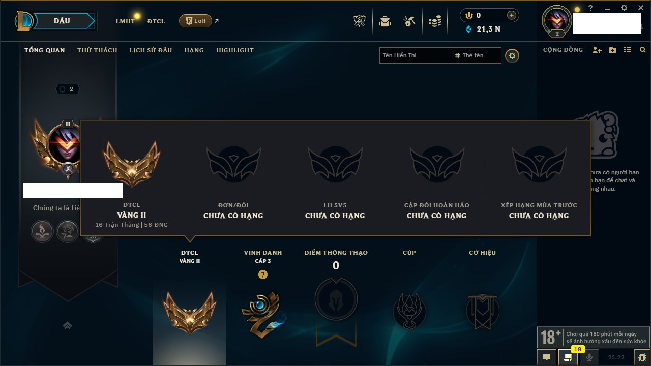 Rank Đơn: Chưa rank mùa nào Khung: Chưa có khung Tướng: 18 - Còn 21345 THX Trang Phục: 2 Rank ĐTCL: Vàng II Linh Thú: 14