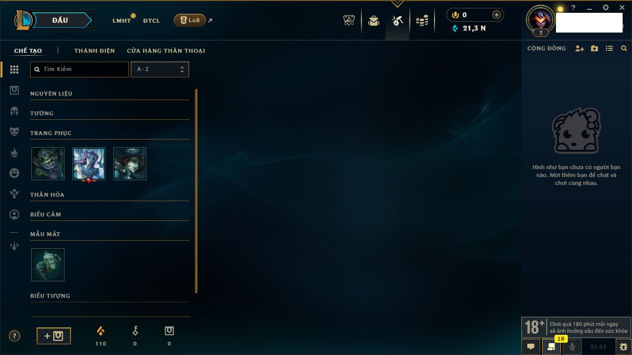 Rank Đơn: Chưa rank mùa nào Khung: Chưa có khung Tướng: 56 - Còn 2186 THX Trang Phục: 1 Rank ĐTCL: Chưa Rank Linh Thú: 25