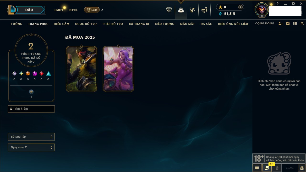 Rank Đơn: Chưa rank mùa nào Khung: Chưa có khung Tướng: 23 - Còn 19045 THX Trang Phục: 2 Rank ĐTCL: Rank Cao Thủ Linh Thú: 114