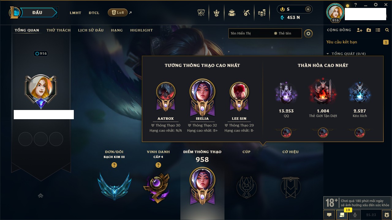 Rank Đơn: Bạch Kim IVKhung: Bạch kimTướng: 171 - Còn 54021 THXTrang Phục: 327Rank ĐTCL: Chưa RankLinh Thú: 115