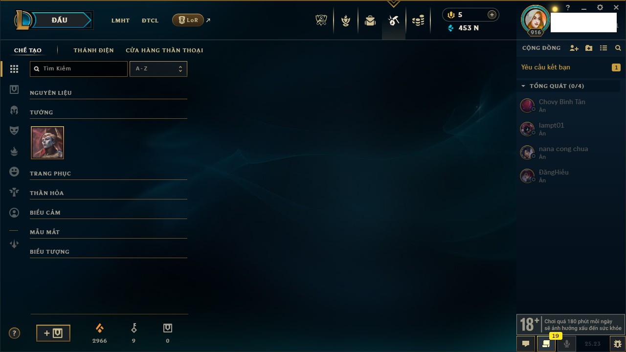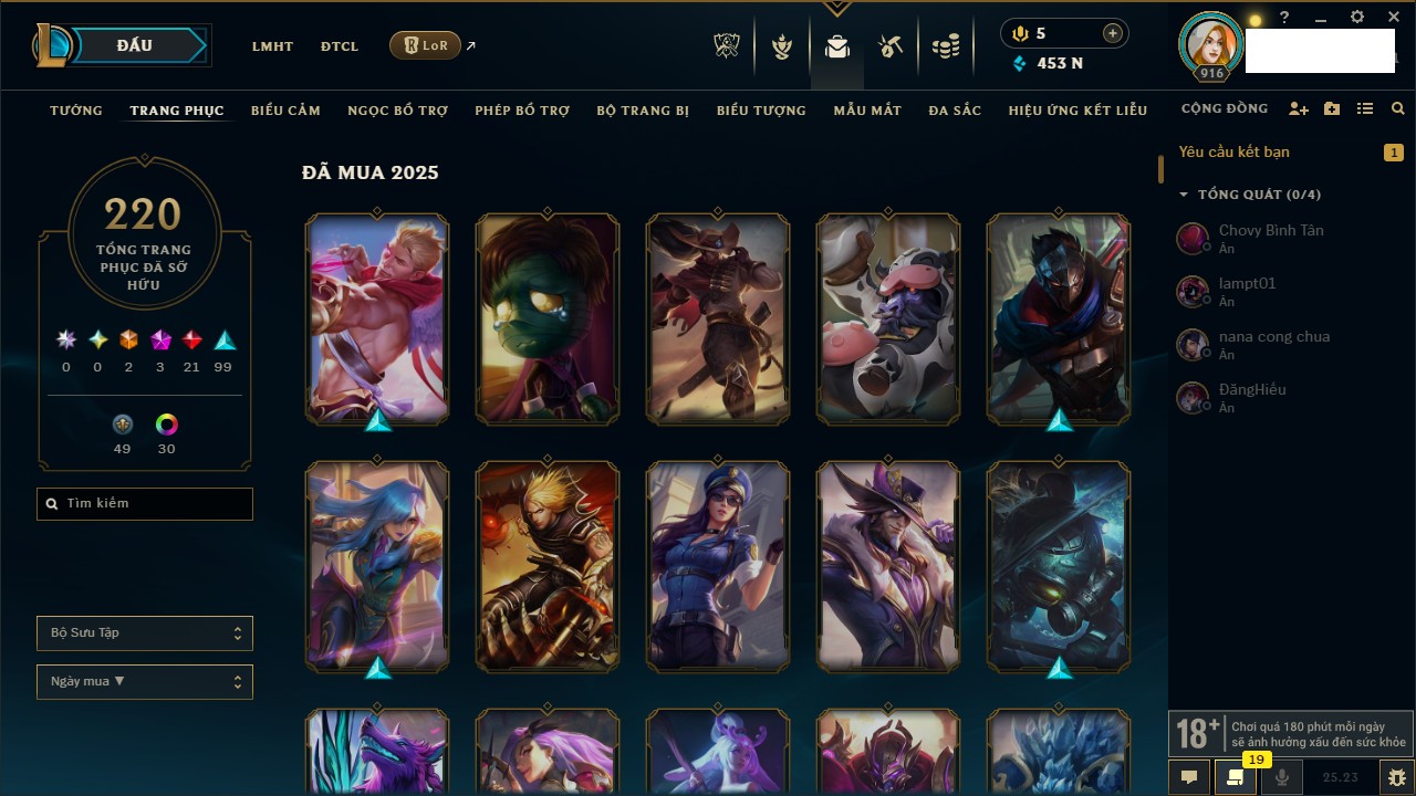 Rank Đơn: Vàng IIIKhung: VàngTướng: 171 - Còn 88128 THXTrang Phục: 329Rank ĐTCL: Chưa RankLinh Thú: 41