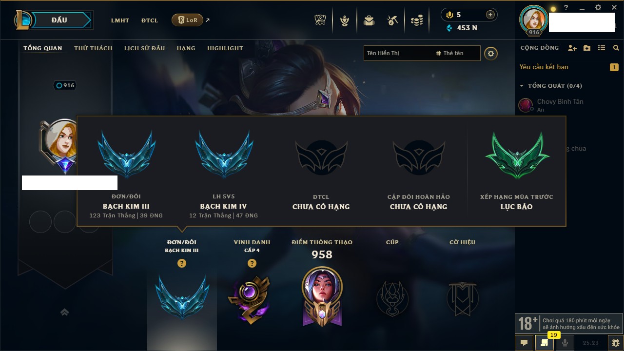 Rank Đơn: Bạch Kim IIKhung: Bạch kimTướng: 171 - Còn 141298 THXTrang Phục: 274Rank ĐTCL: Bạch Kim IILinh Thú: 188