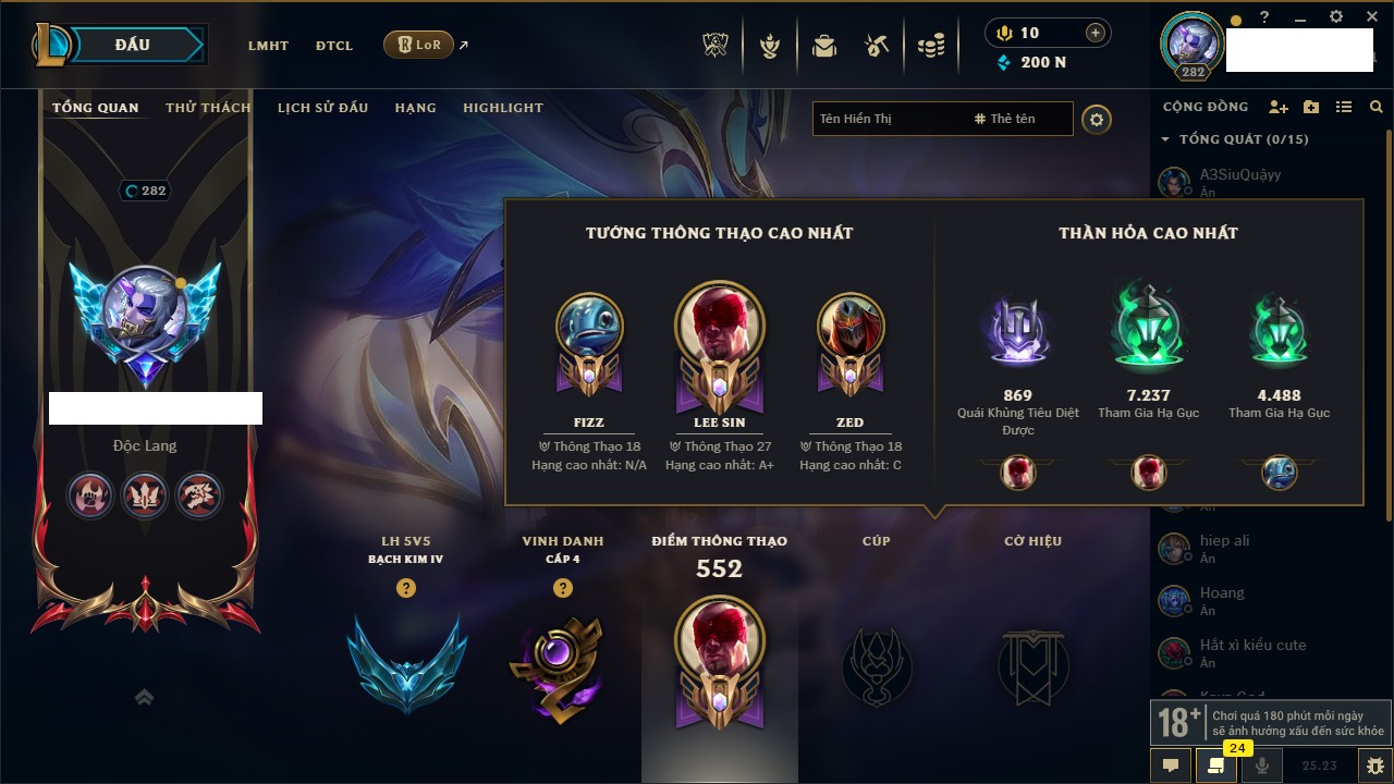 Rank Đơn: Đồng IVKhung: ĐồngTướng: 171 - Còn 33878 THXTrang Phục: 229Rank ĐTCL: Chưa RankLinh Thú: 85