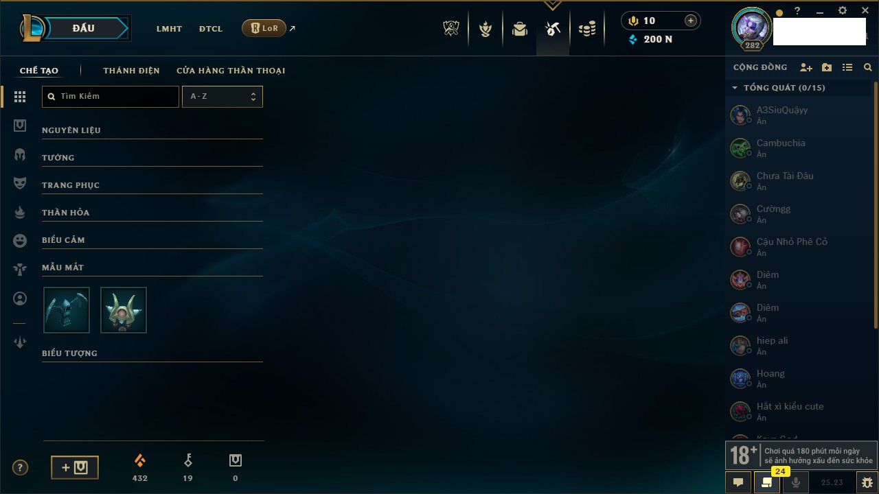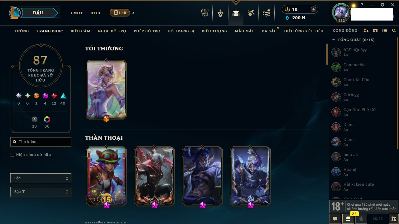 Rank Đơn: Vàng IIIKhung: VàngTướng: 172 - Còn 200315 THXTrang Phục: 87Rank ĐTCL: Chưa RankLinh Thú: 136