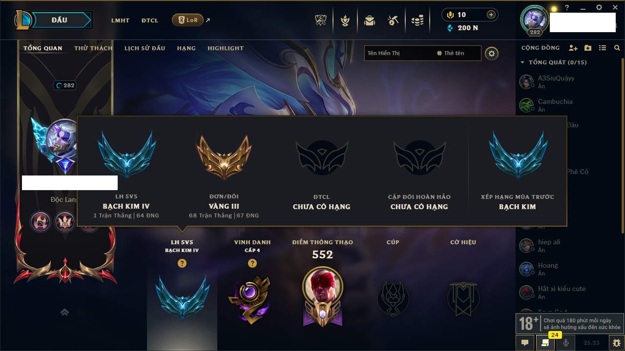 Rank Đơn: Vàng IIKhung: Bạch kimTướng: 172 - Còn 123420 THXTrang Phục: 231Rank ĐTCL: Bạch Kim IVLinh Thú: 213