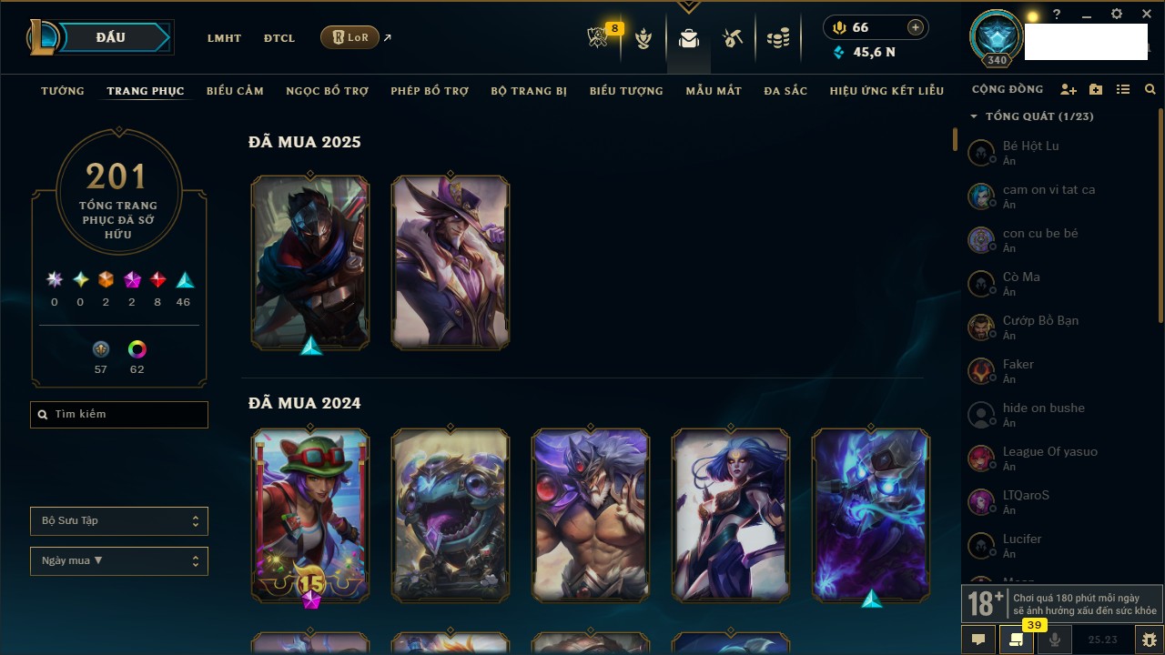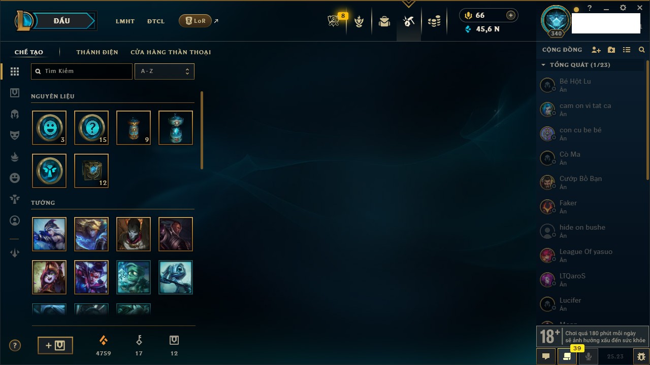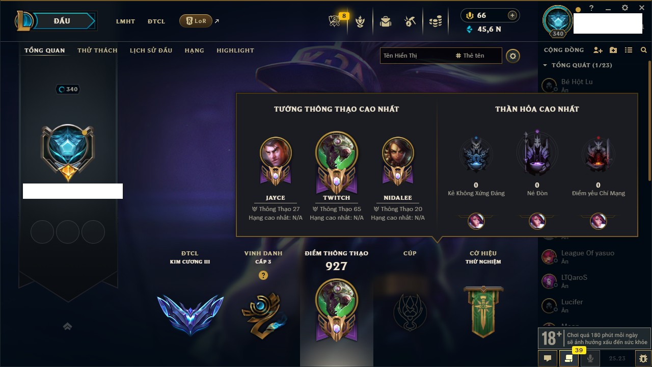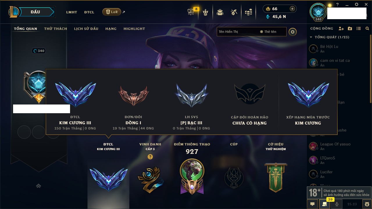 Rank Đơn: Bạc IIIKhung: BạcTướng: 171 - Còn 51045 THXTrang Phục: 220Rank ĐTCL: Sắt IILinh Thú: 141