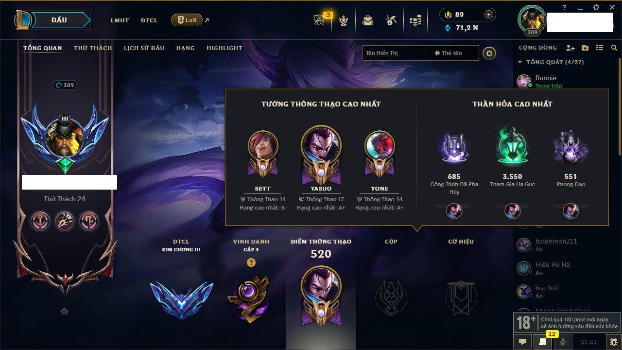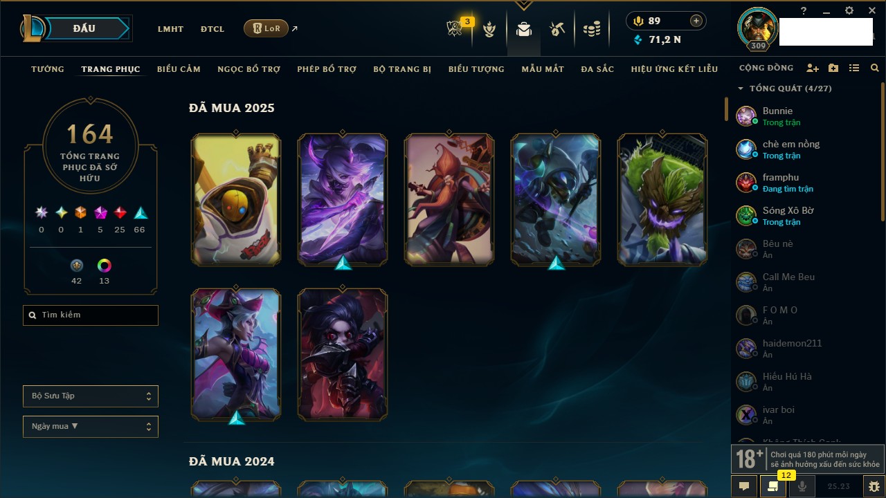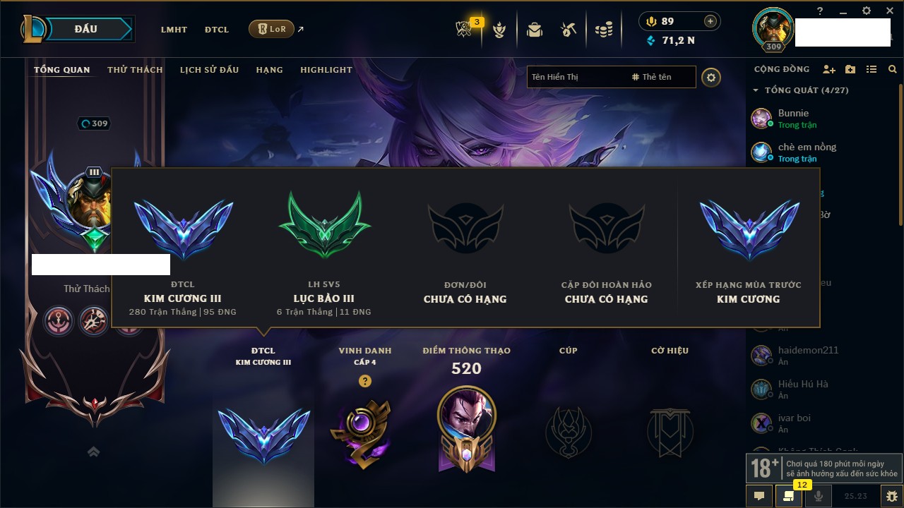 Rank Đơn: Vàng IKhung: Bạch kimTướng: 170 - Còn 212450 THXTrang Phục: 214Rank ĐTCL: Bạch Kim IVLinh Thú: 221