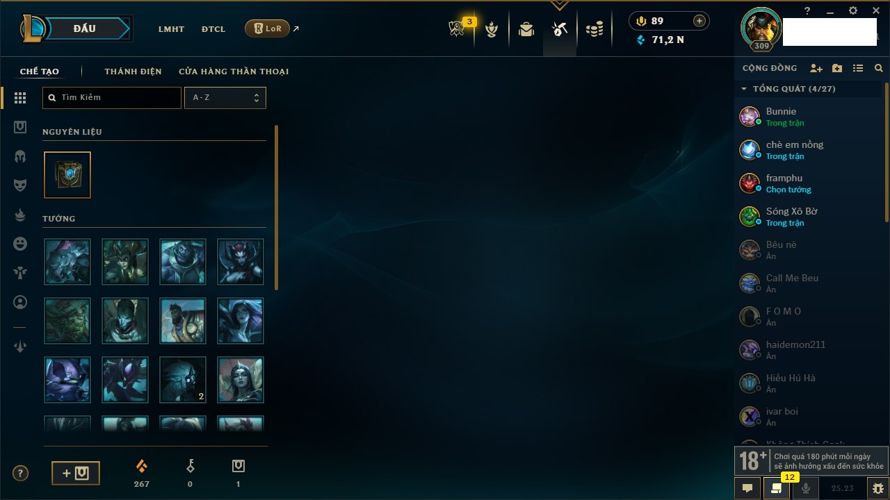 Rank Đơn: Bạch Kim IIKhung: Bạch kimTướng: 171 - Còn 263986 THXTrang Phục: 306Rank ĐTCL: Lục Bảo IVLinh Thú: 96
