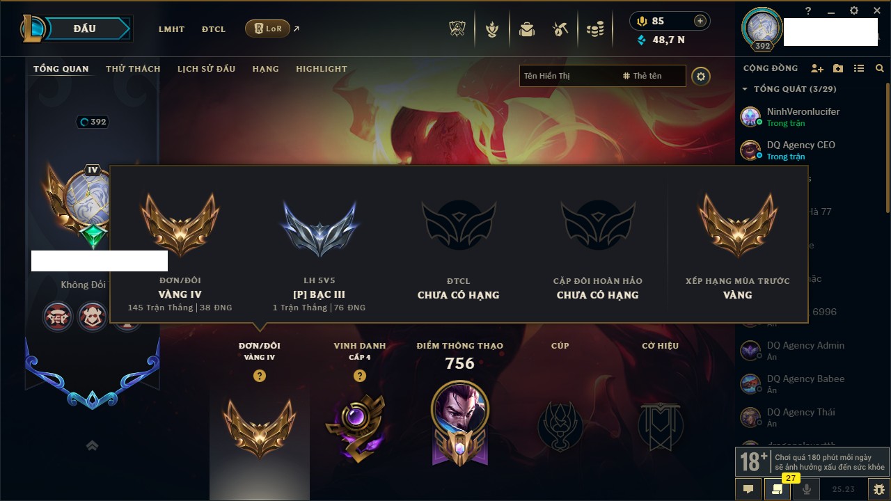 Rank Đơn: Bạc IIKhung: VàngTướng: 171 - Còn 332462 THXTrang Phục: 165Rank ĐTCL: Kim Cương IVLinh Thú: 181