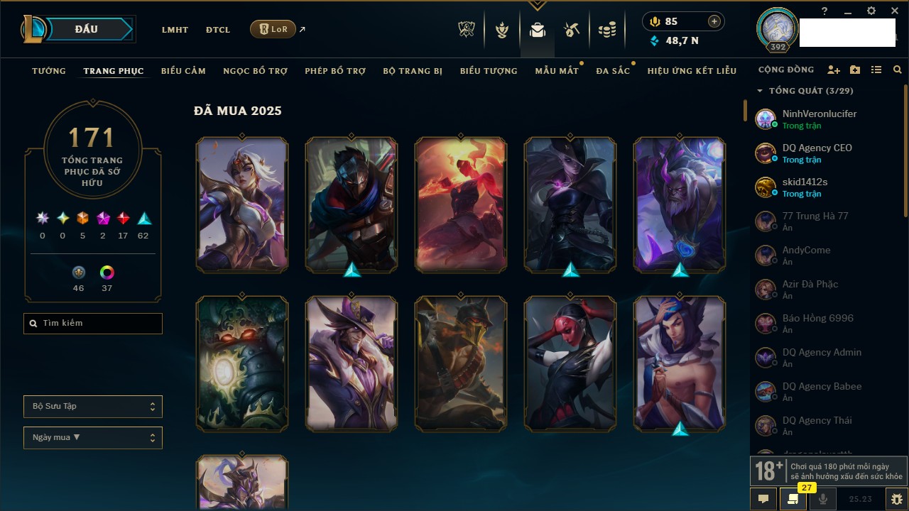 Rank Đơn: Vàng IVKhung: VàngTướng: 171 - Còn 48721 THXTrang Phục: 171Rank ĐTCL: Chưa RankLinh Thú: 27