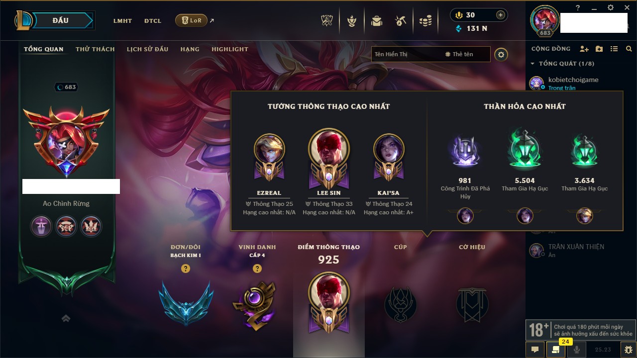 Rank Đơn: Bạch Kim IVKhung: Bạch kimTướng: 171 - Còn 54021 THXTrang Phục: 327Rank ĐTCL: Chưa RankLinh Thú: 115