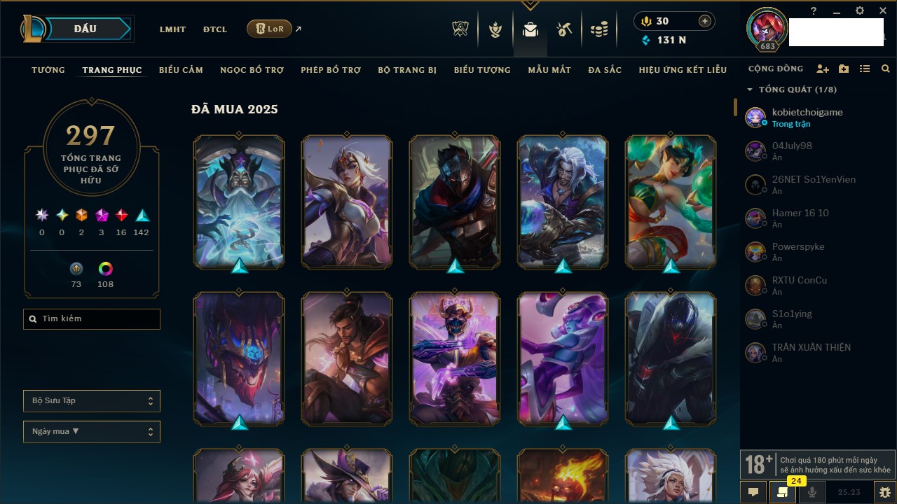 Rank Đơn: Vàng IIIKhung: VàngTướng: 171 - Còn 88128 THXTrang Phục: 329Rank ĐTCL: Chưa RankLinh Thú: 41