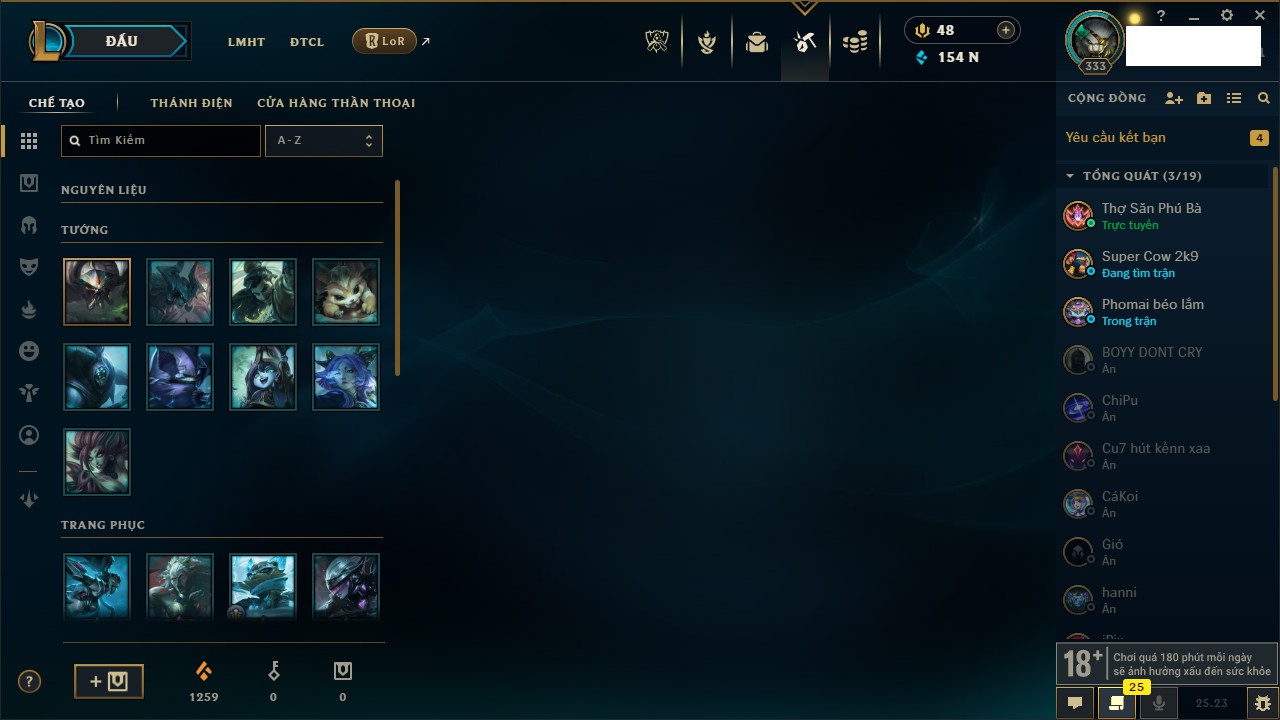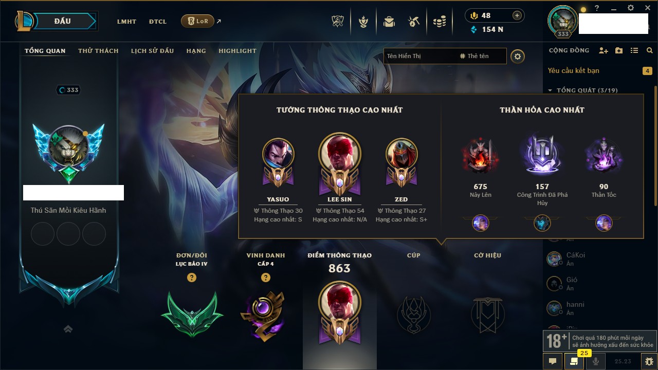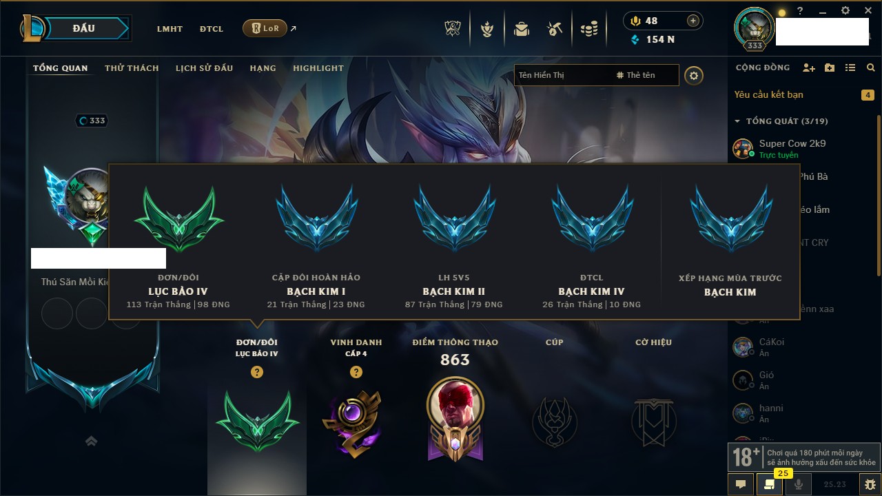 Rank Đơn: Lục Bảo IVKhung: VàngTướng: 171 - Còn 154648 THXTrang Phục: 203Rank ĐTCL: Bạch Kim IVLinh Thú: 69