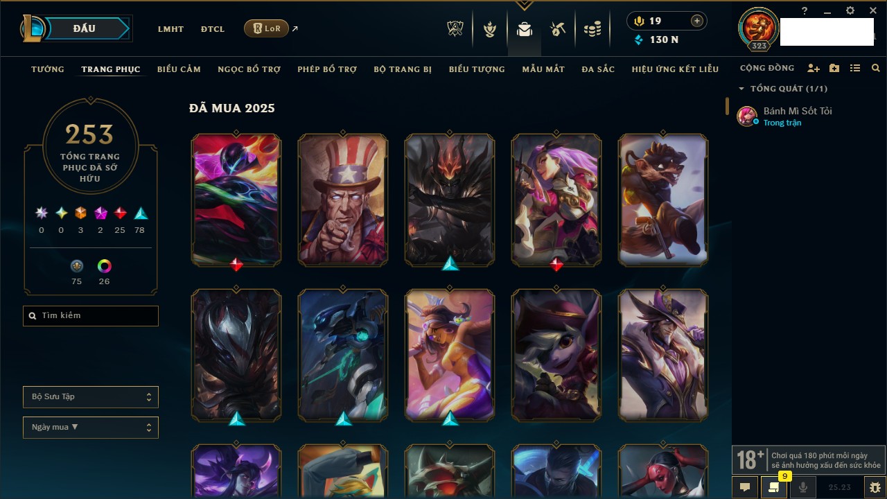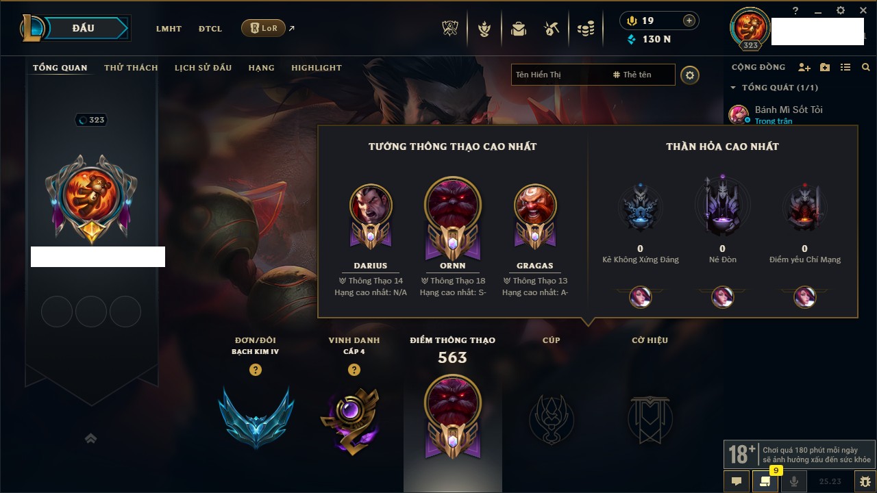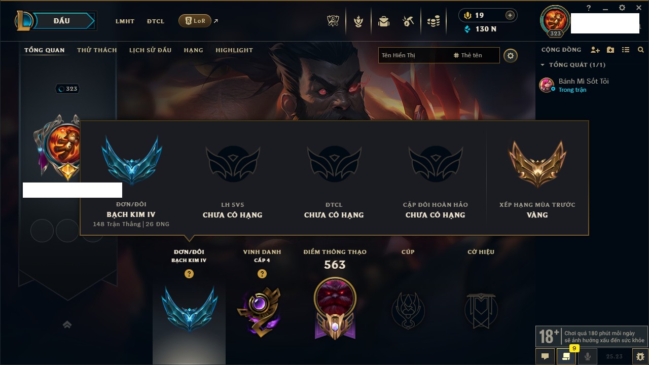 Rank Đơn: Bạch Kim IVKhung: VàngTướng: 171 - Còn 130578 THXTrang Phục: 253Rank ĐTCL: Chưa RankLinh Thú: 20