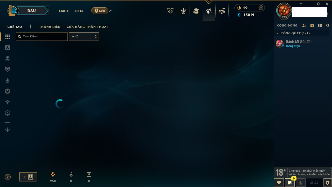 Rank Đơn: Bạch Kim IVKhung: VàngTướng: 171 - Còn 130280 THXTrang Phục: 226Rank ĐTCL: Kim Cương IVLinh Thú: 183