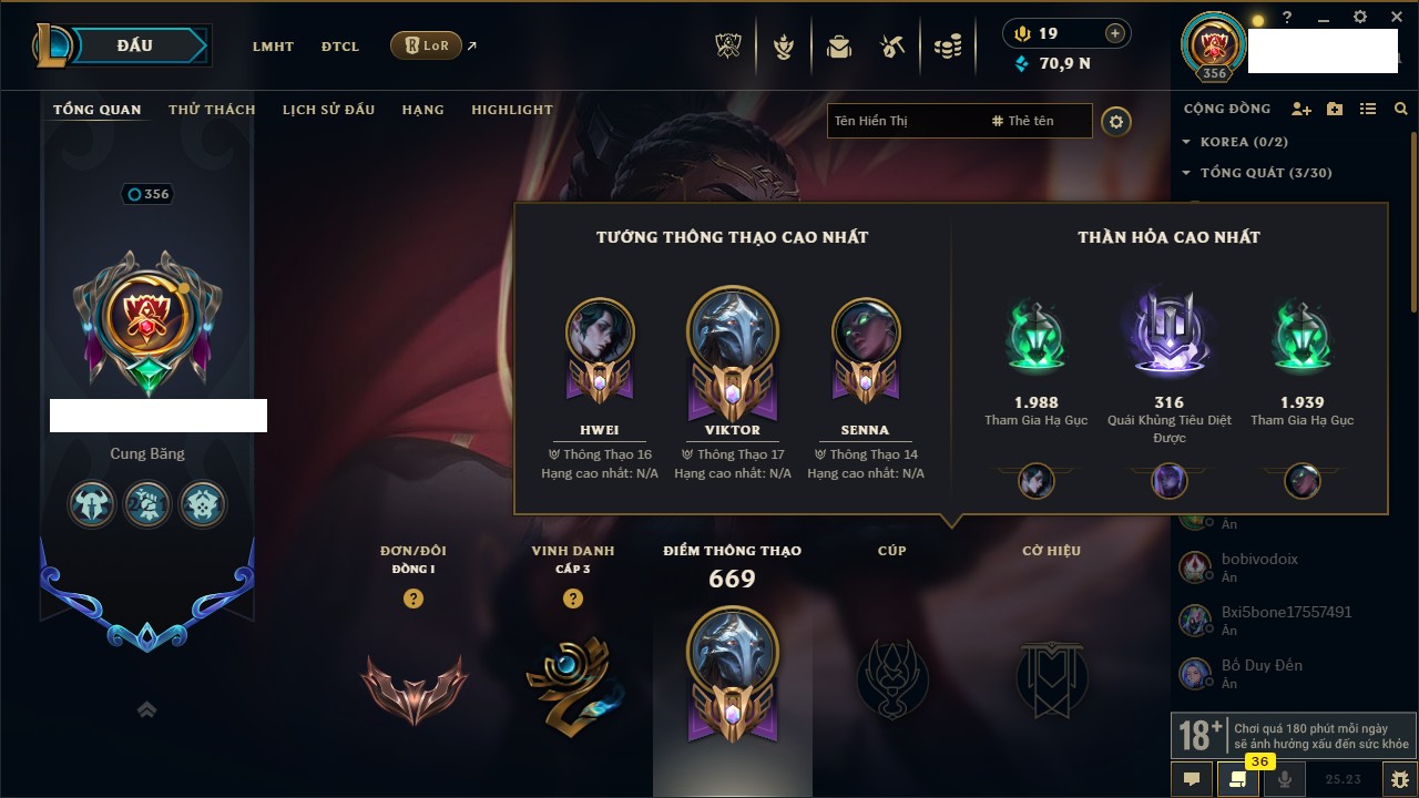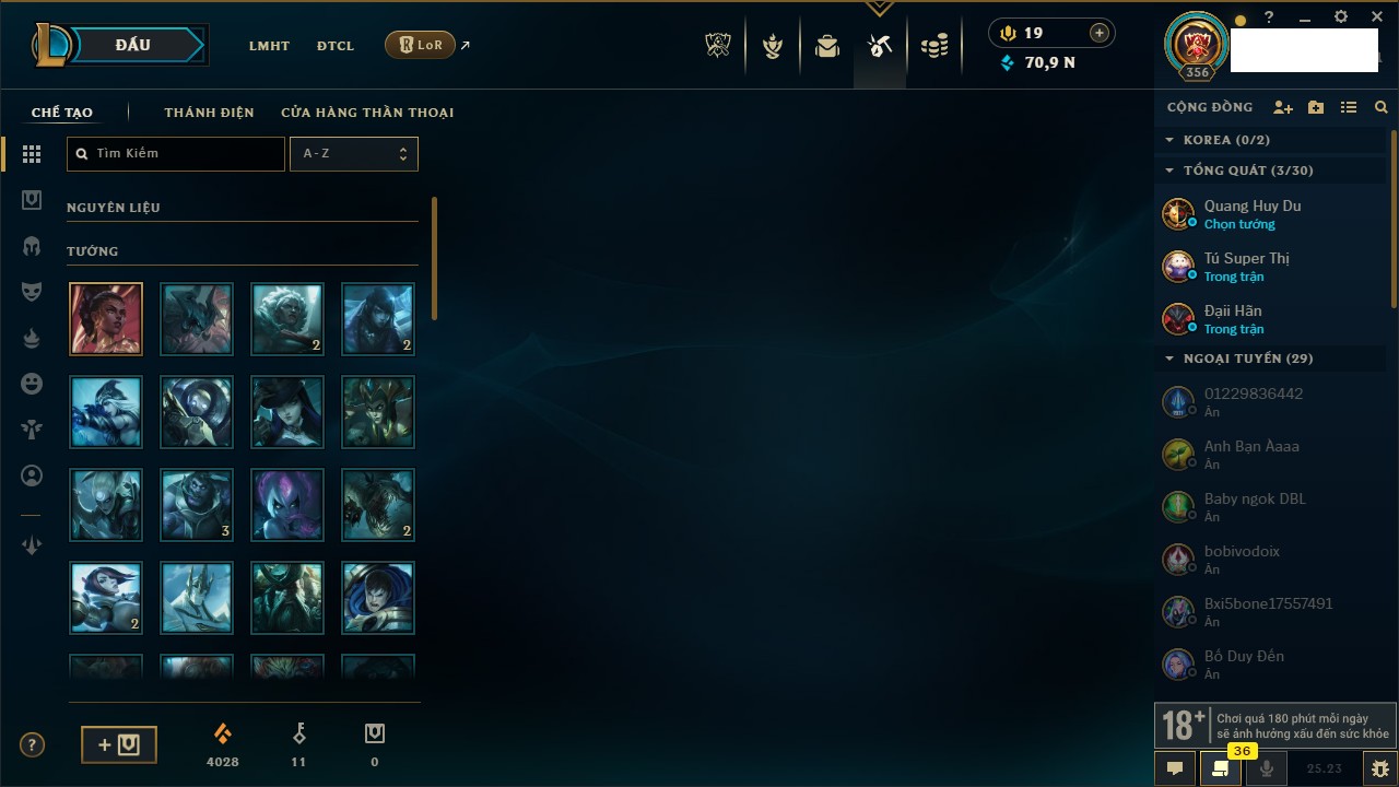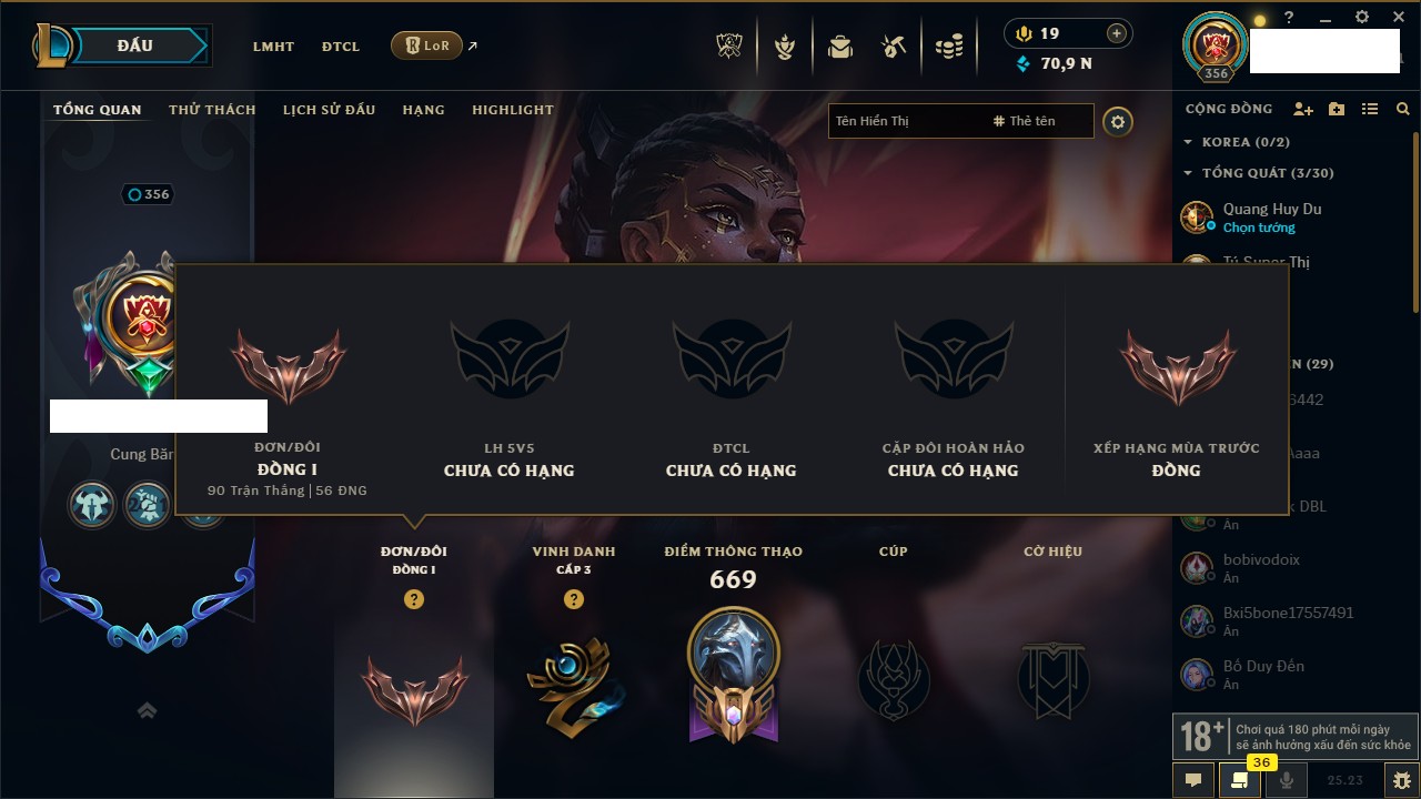 Rank Đơn: Đồng IIKhung: Chưa có khungTướng: 170 - Còn 56487 THXTrang Phục: 90Rank ĐTCL: Chưa RankLinh Thú: 129
