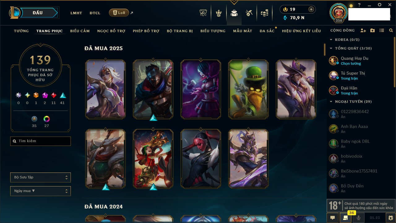 Rank Đơn: Đồng IKhung: ĐồngTướng: 167 - Còn 70949 THXTrang Phục: 139Rank ĐTCL: Chưa RankLinh Thú: 37