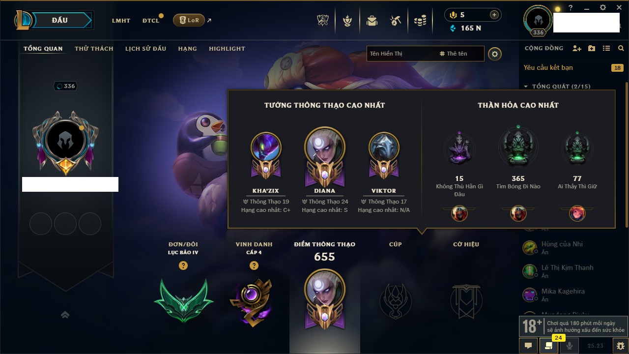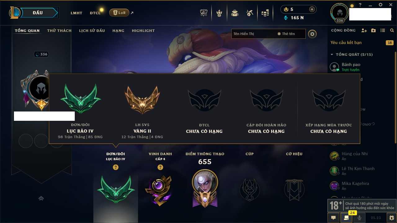 Rank Đơn: Bạc IIIKhung: Chưa có khungTướng: 171 - Còn 21493 THXTrang Phục: 252Rank ĐTCL: Bạch Kim IVLinh Thú: 123