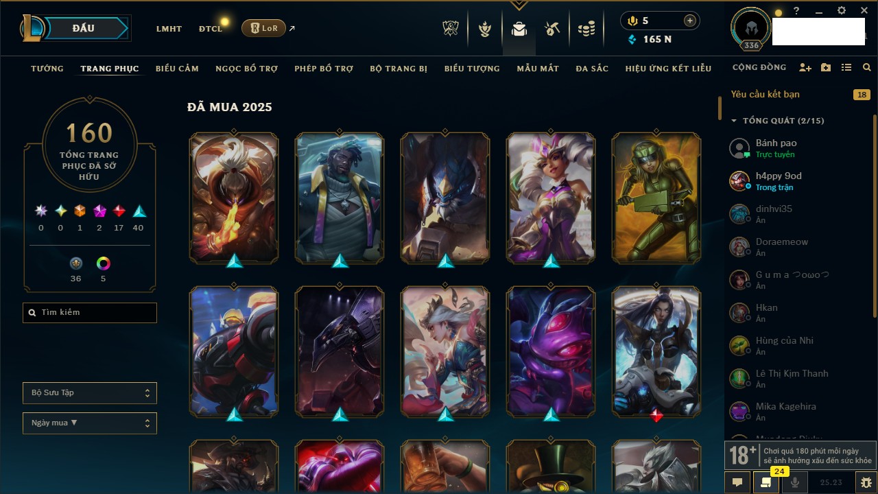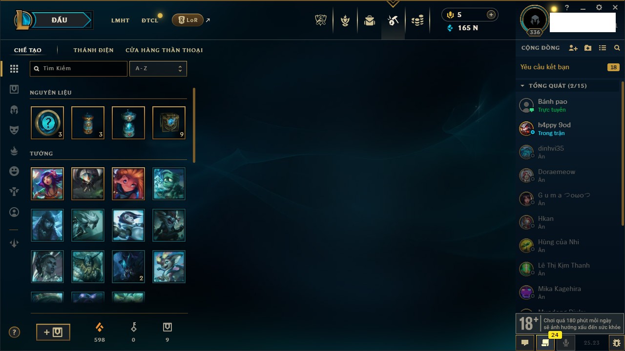 Rank Đơn: Vàng IIKhung: VàngTướng: 171 - Còn 34018 THXTrang Phục: 250Rank ĐTCL: Sắt IILinh Thú: 19