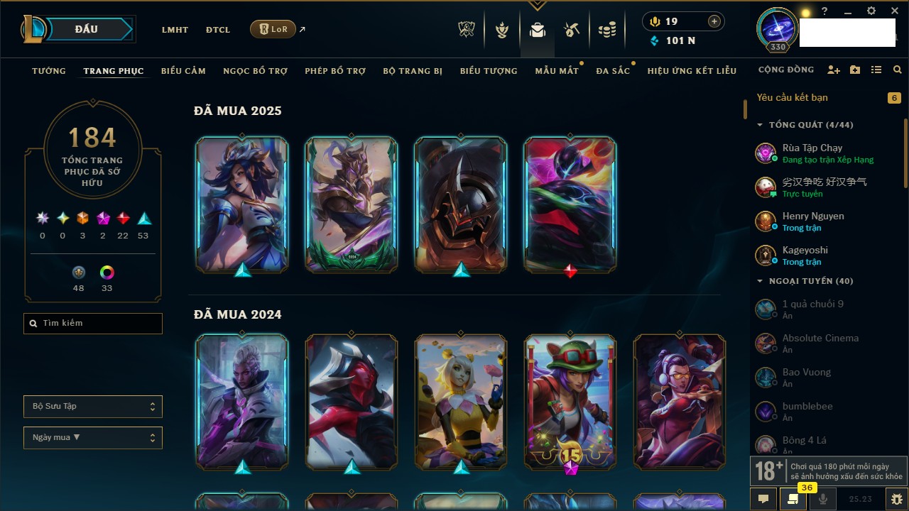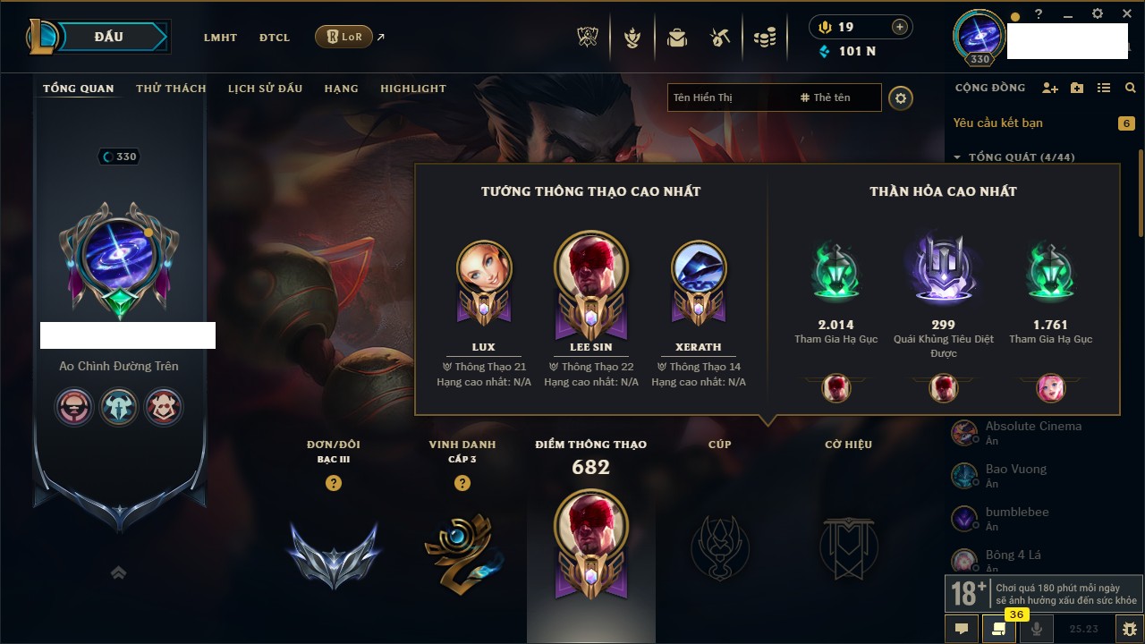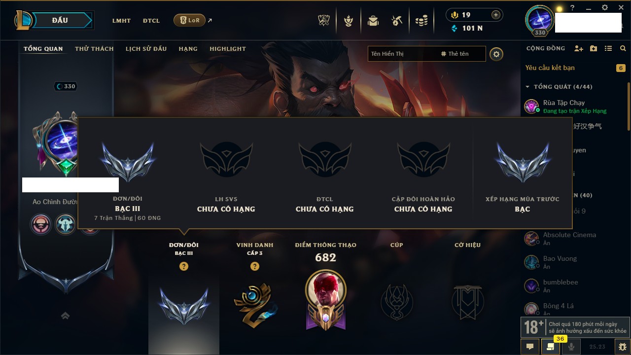 Rank Đơn: Bạc IIIKhung: BạcTướng: 168 - Còn 101710 THXTrang Phục: 184Rank ĐTCL: Chưa RankLinh Thú: 17