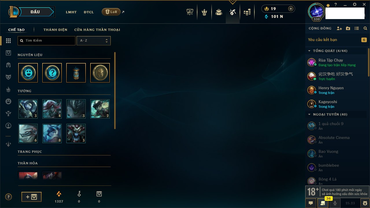 Rank Đơn: Bạc IVKhung: BạcTướng: 171 - Còn 102637 THXTrang Phục: 169Rank ĐTCL: Vàng IILinh Thú: 127