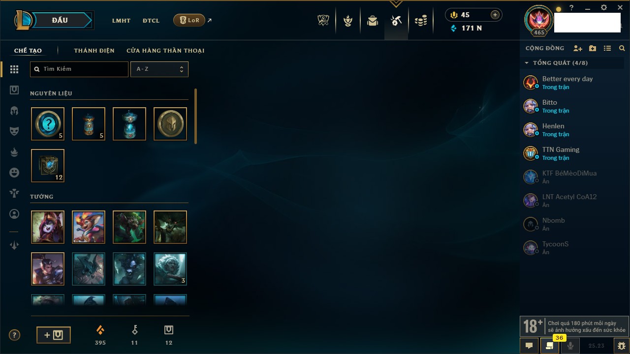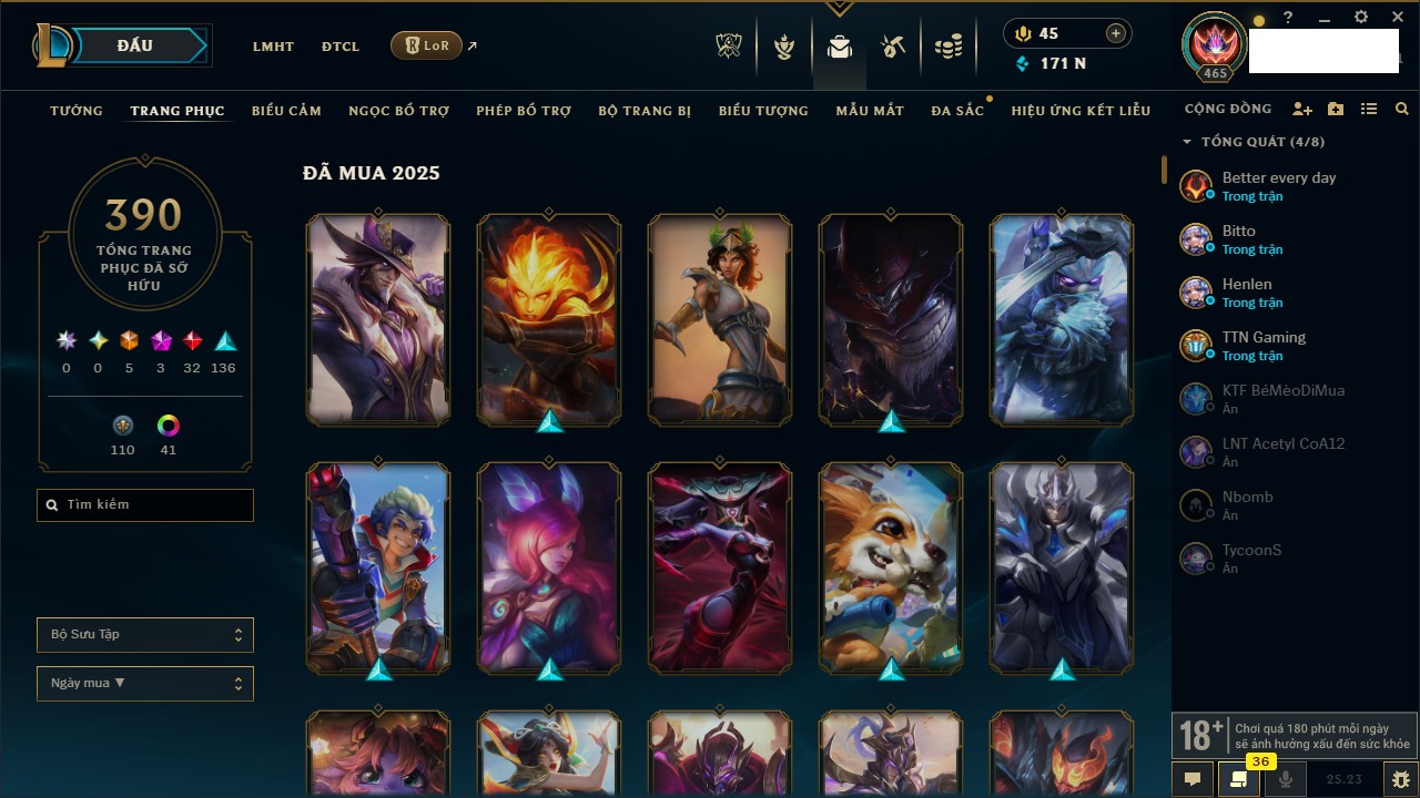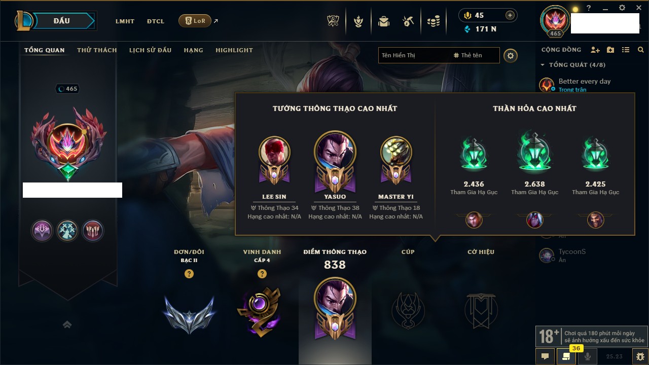 Rank Đơn: Bạc IIKhung: BạcTướng: 171 - Còn 171670 THXTrang Phục: 390Rank ĐTCL: Chưa RankLinh Thú: 41