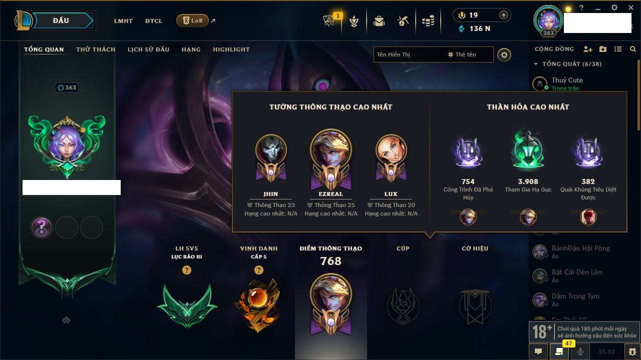 Rank Đơn: Bạch Kim IIIKhung: Bạch kimTướng: 171 - Còn 136108 THXTrang Phục: 261Rank ĐTCL: Bạc IVLinh Thú: 73