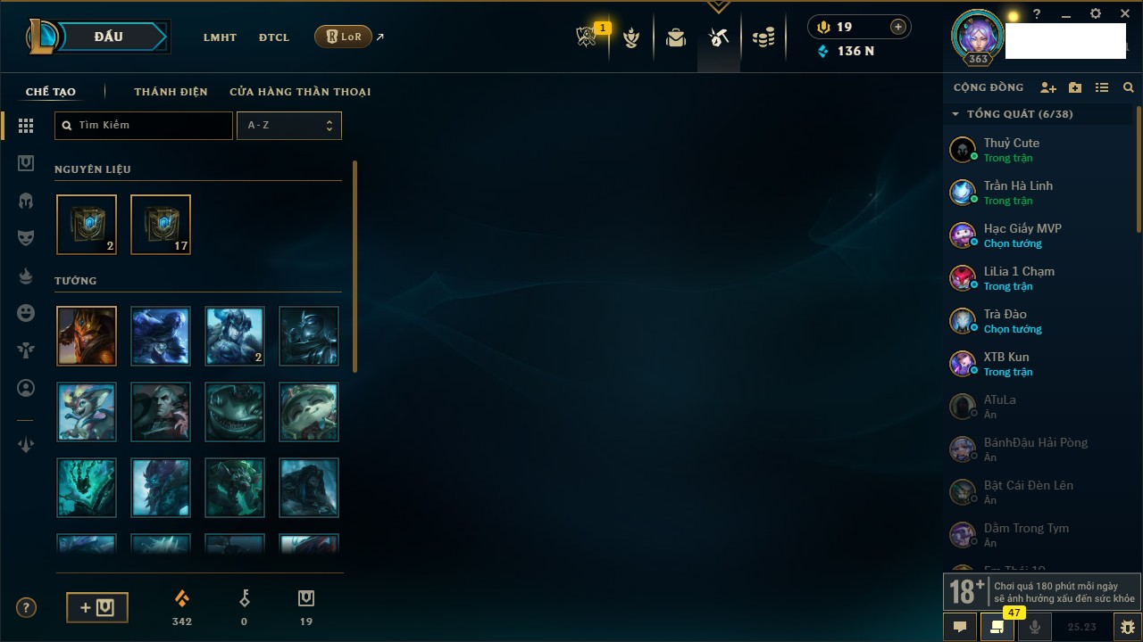 Rank Đơn: Bạc IIIKhung: BạcTướng: 171 - Còn 190352 THXTrang Phục: 260Rank ĐTCL: Sắt IILinh Thú: 31