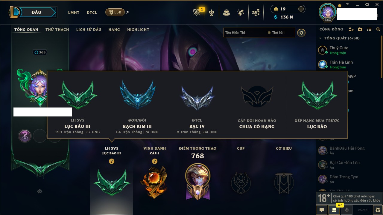 Rank Đơn: Lục Bảo IVKhung: VàngTướng: 171 - Còn 154648 THXTrang Phục: 203Rank ĐTCL: Bạch Kim IVLinh Thú: 69
