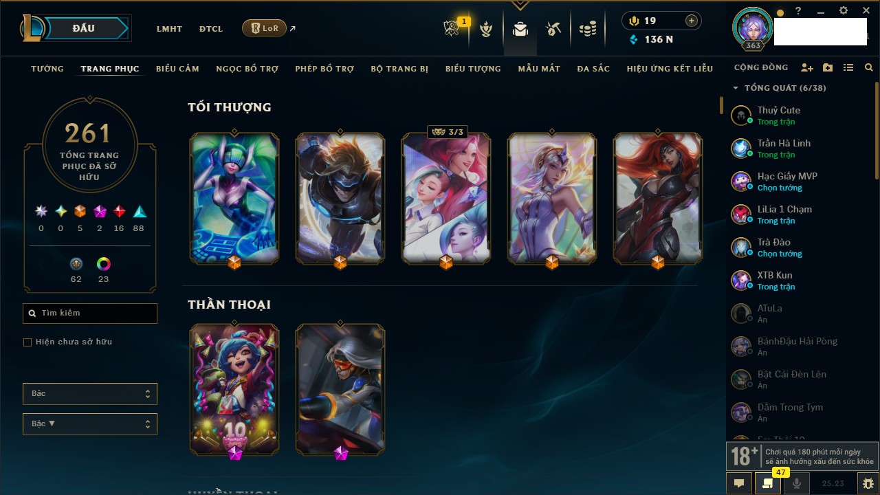 Rank Đơn: Bạch Kim IIKhung: Bạch kimTướng: 171 - Còn 316137 THXTrang Phục: 89Rank ĐTCL: Bạch Kim IIILinh Thú: 94