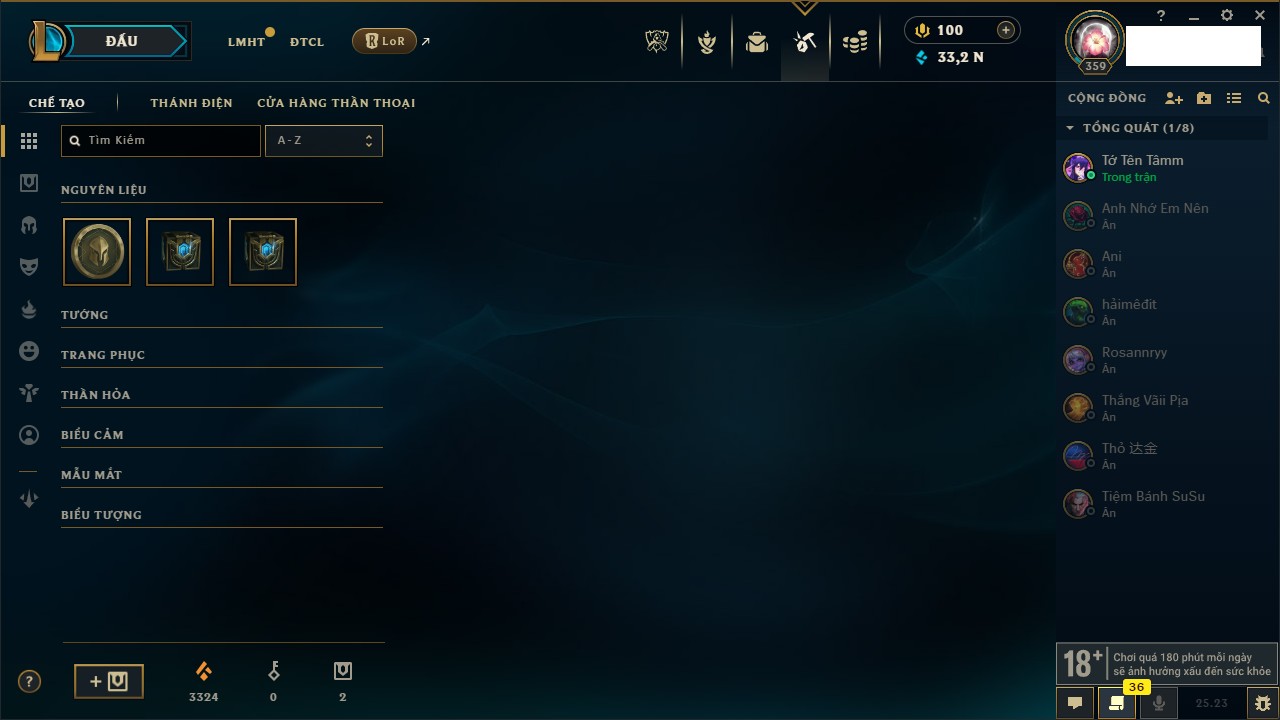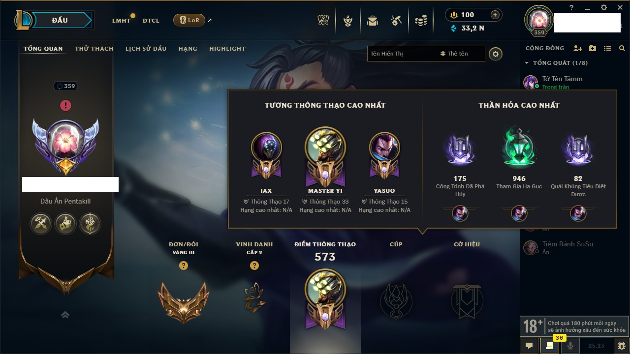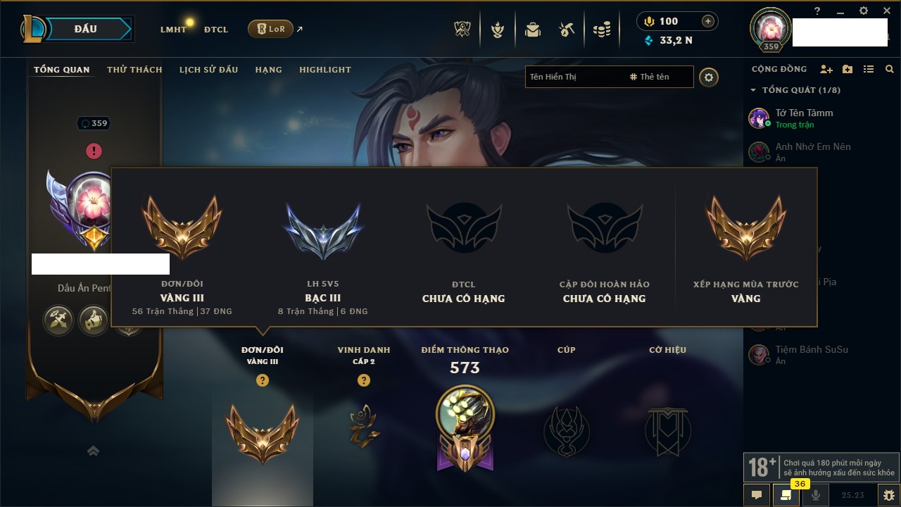Rank Đơn: Đồng IIKhung: Chưa có khungTướng: 170 - Còn 56487 THXTrang Phục: 90Rank ĐTCL: Chưa RankLinh Thú: 129