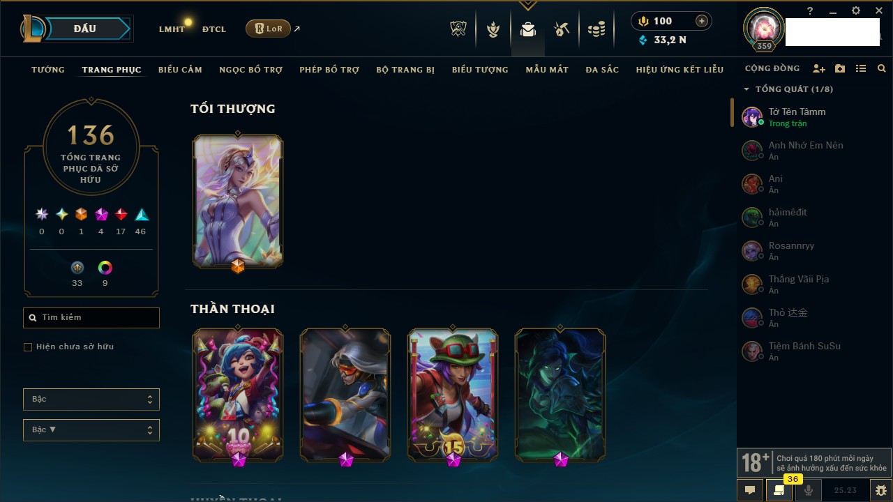Rank Đơn: Vàng IIIKhung: VàngTướng: 170 - Còn 33222 THXTrang Phục: 136Rank ĐTCL: Chưa RankLinh Thú: 40