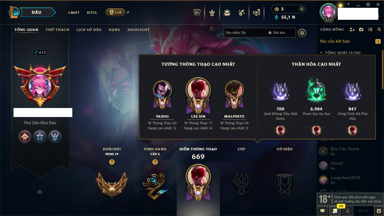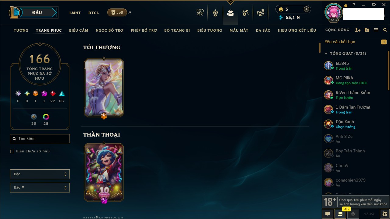 Rank Đơn: Vàng IVKhung: BạcTướng: 166 - Còn 180925 THXTrang Phục: 163Rank ĐTCL: Chưa RankLinh Thú: 67