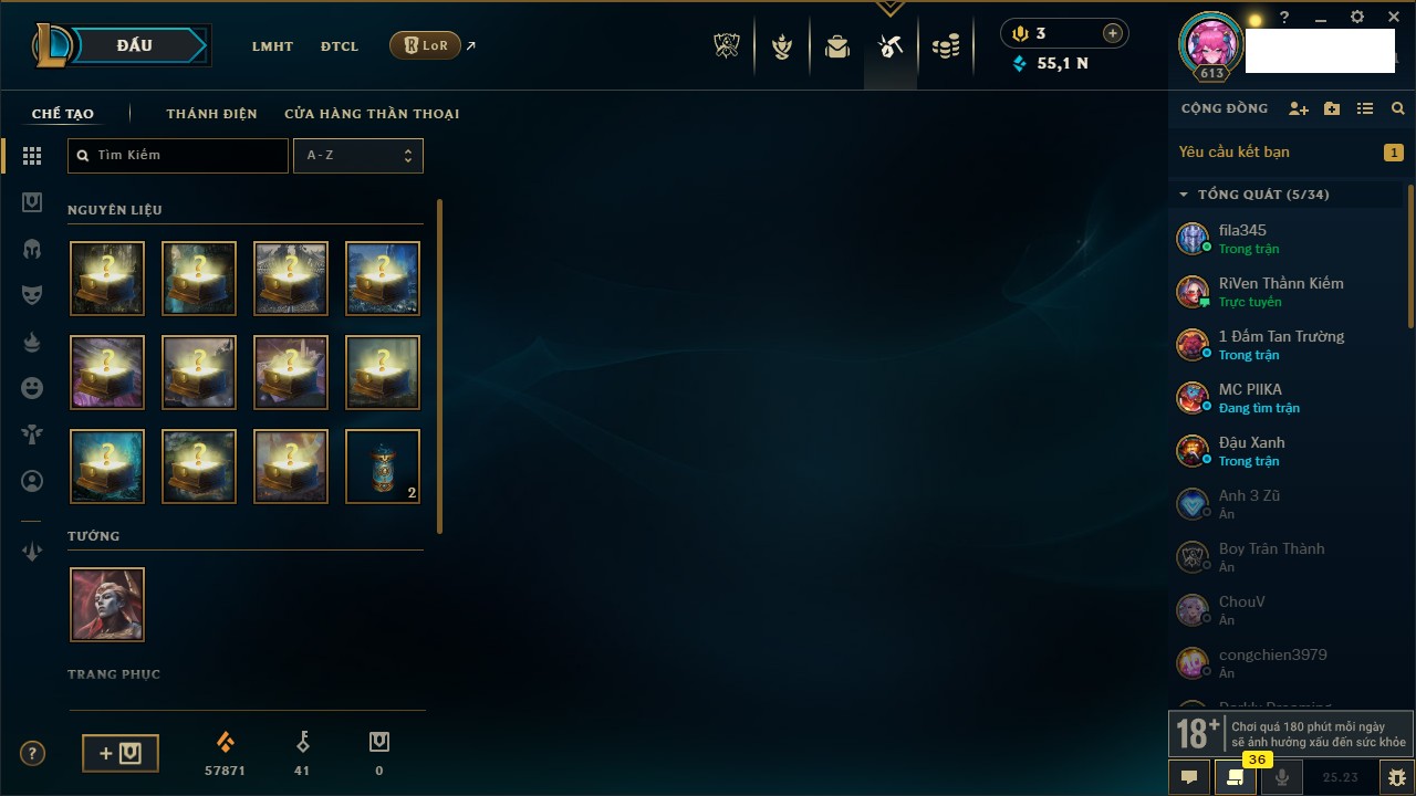 Rank Đơn: Vàng IVKhung: VàngTướng: 171 - Còn 48721 THXTrang Phục: 171Rank ĐTCL: Chưa RankLinh Thú: 27
