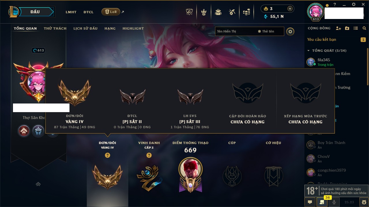 Rank Đơn: Vàng IVKhung: Chưa có khungTướng: 172 - Còn 55166 THXTrang Phục: 166Rank ĐTCL: Sắt IILinh Thú: 173