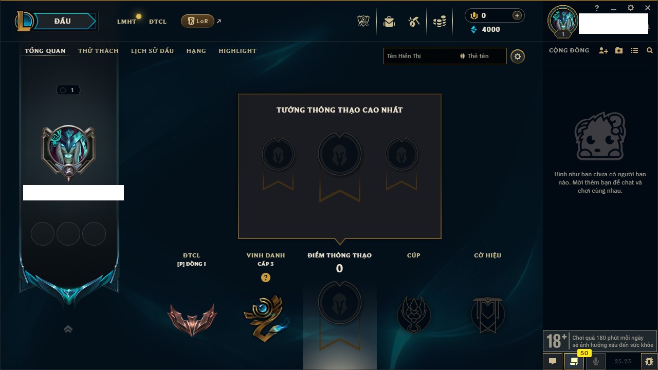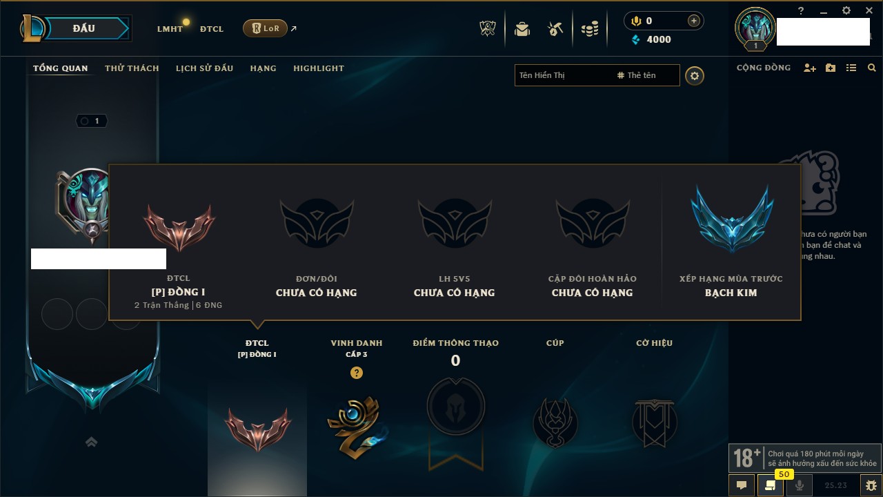 Rank Đơn: Chưa rank mùa nàoKhung: Chưa có khungTướng: 4 - Còn 12000 THXTrang Phục: 0Rank ĐTCL: Bạch Kim IIILinh Thú: 20
