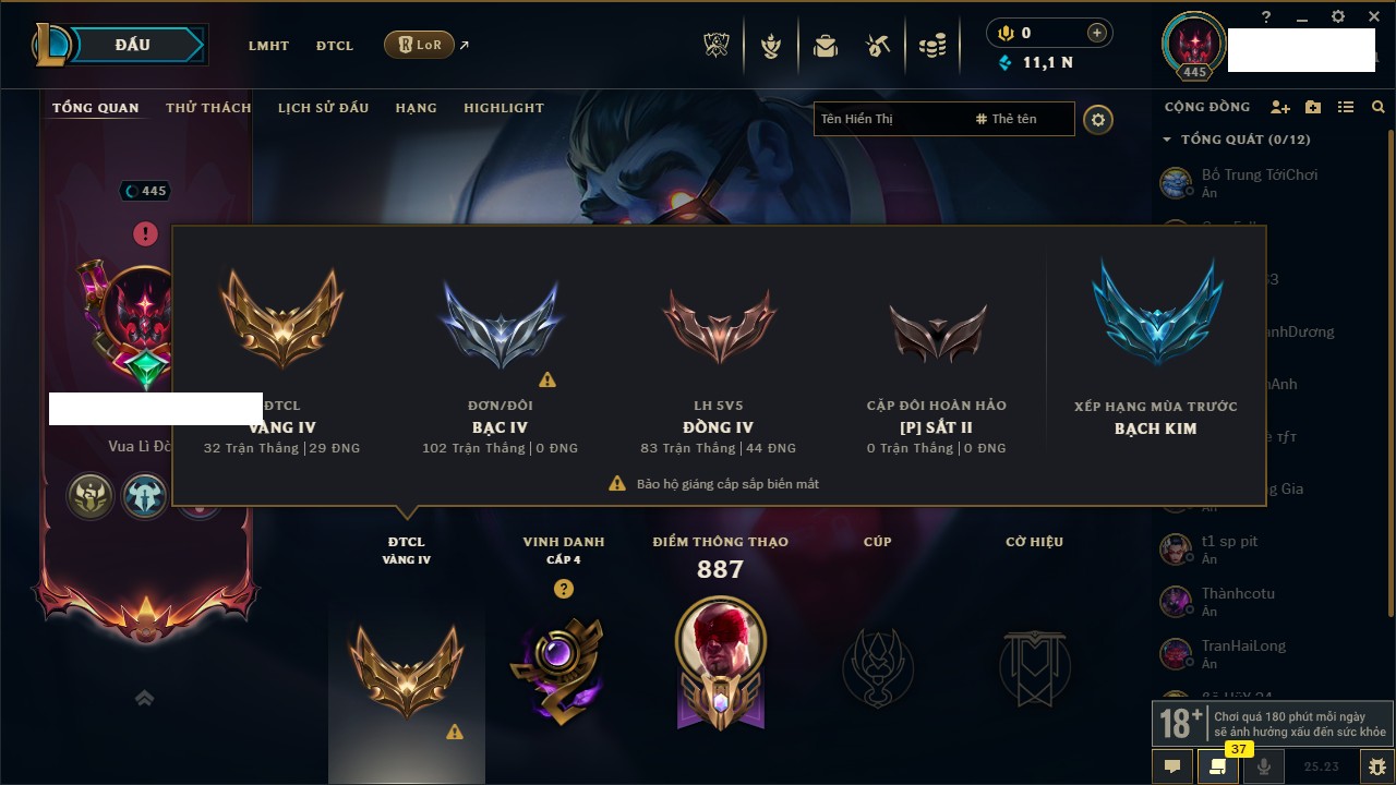 Rank Đơn: Bạc IV Khung: Vàng Tướng: 172 - Còn 11123 THX Trang Phục: 288 Rank ĐTCL: Vàng IV Linh Thú: 117