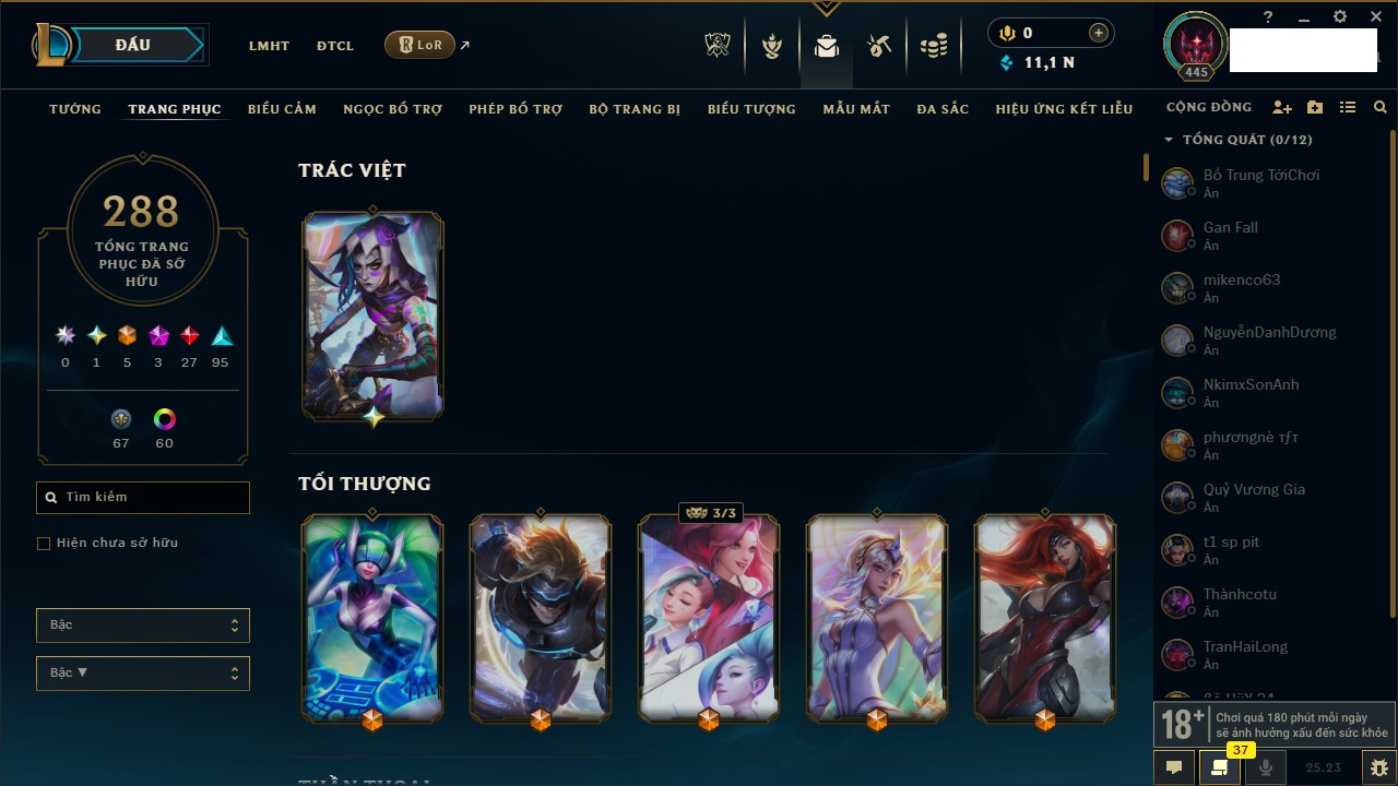 Rank Đơn: Chưa rank mùa nào Khung: Chưa có khung Tướng: 48 - Còn 9500 THX Trang Phục: 12 Rank ĐTCL: Kim Cương II Linh Thú: 128