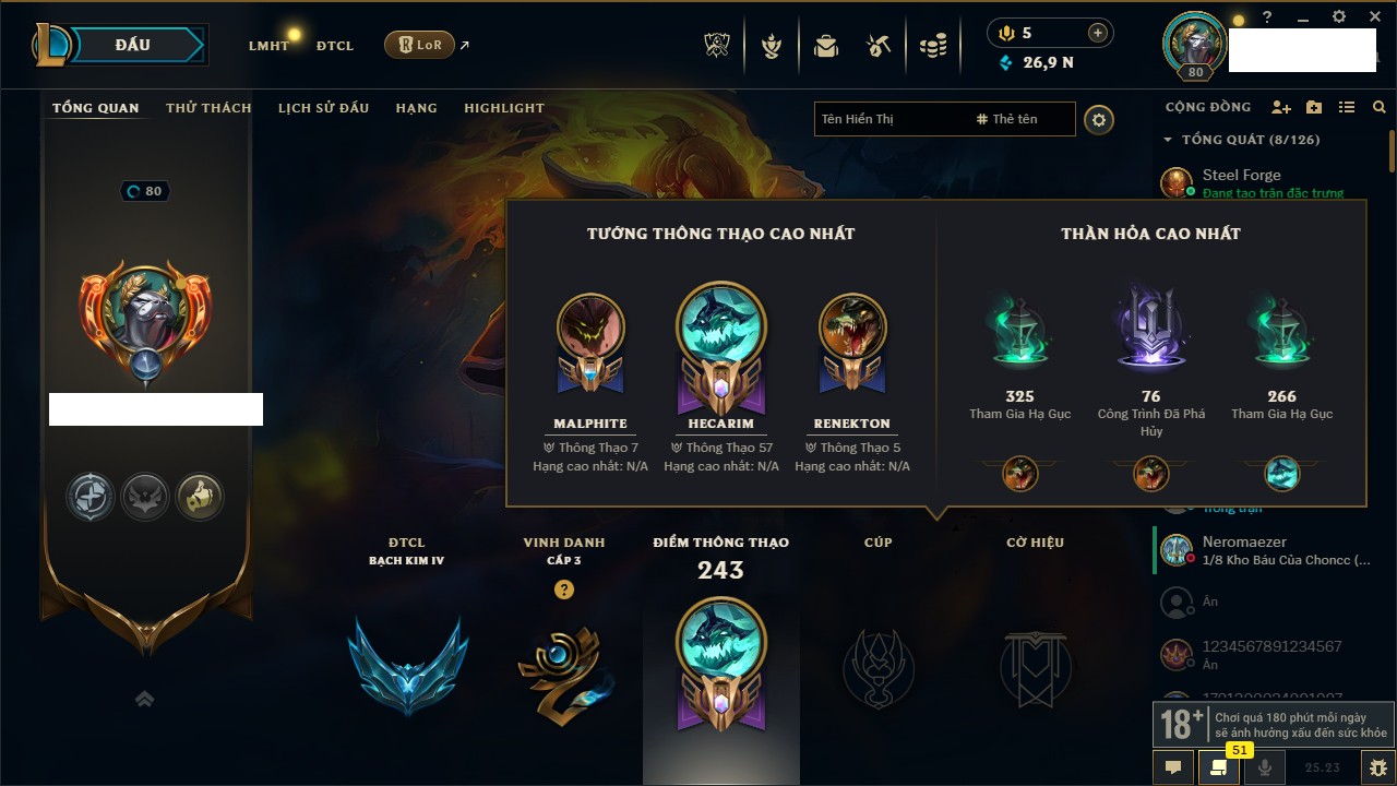 Rank Đơn: Vàng IVKhung: VàngTướng: 171 - Còn 48721 THXTrang Phục: 171Rank ĐTCL: Chưa RankLinh Thú: 27