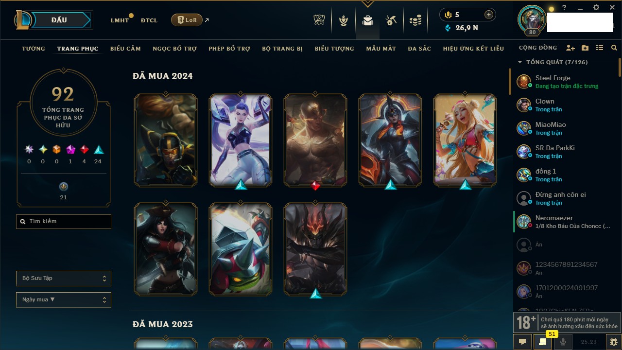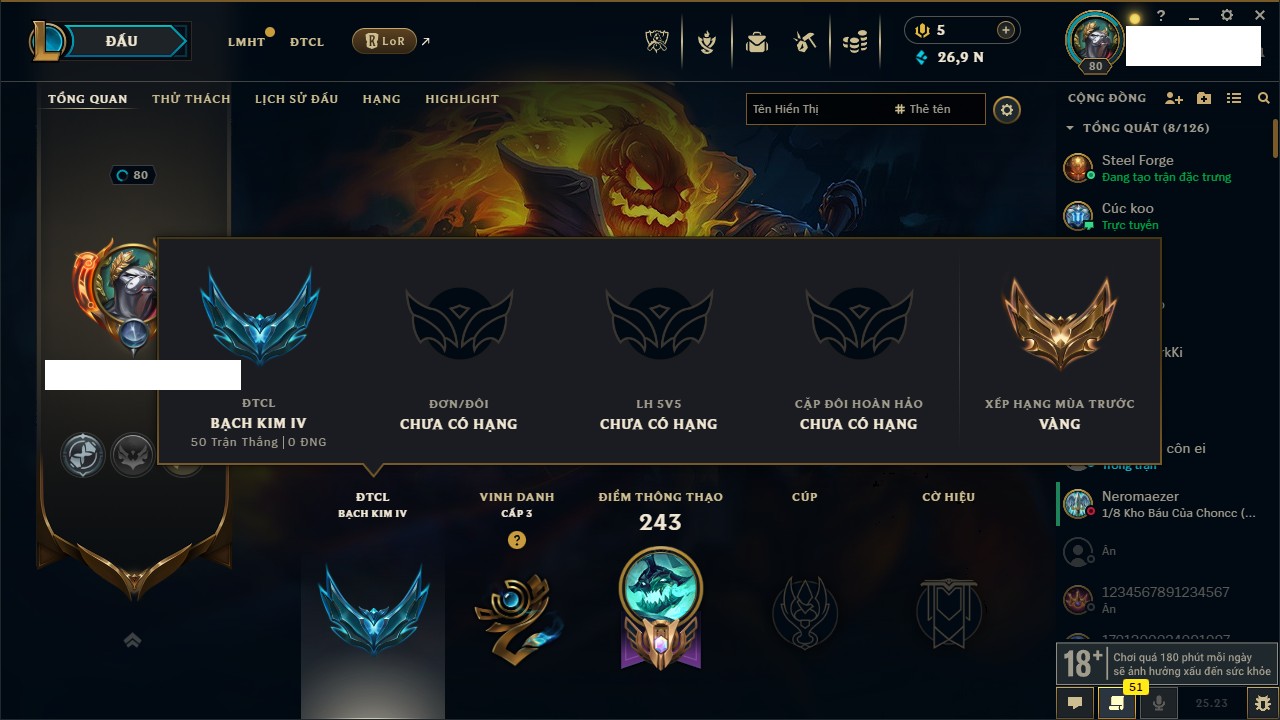 Rank Đơn: Vàng IVKhung: BạcTướng: 166 - Còn 180925 THXTrang Phục: 163Rank ĐTCL: Chưa RankLinh Thú: 67