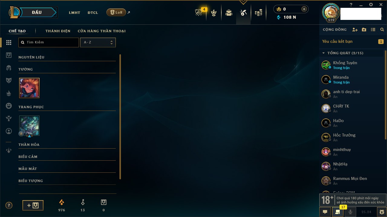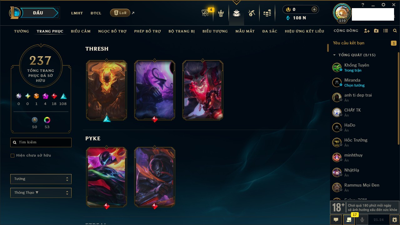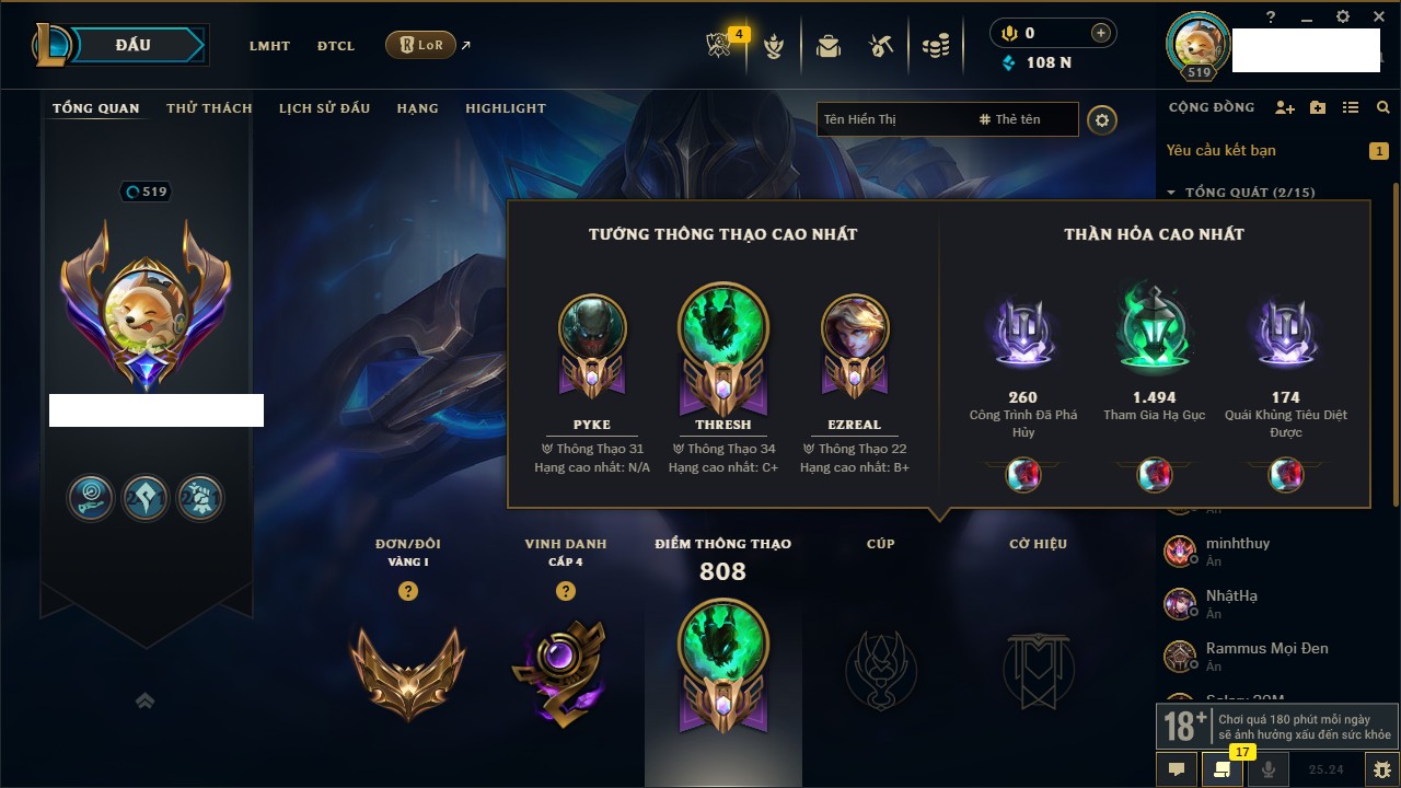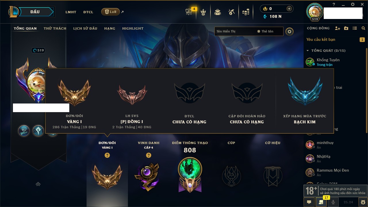 Rank Đơn: Vàng IKhung: Bạch kimTướng: 172 - Còn 108407 THXTrang Phục: 237Rank ĐTCL: Chưa RankLinh Thú: 44