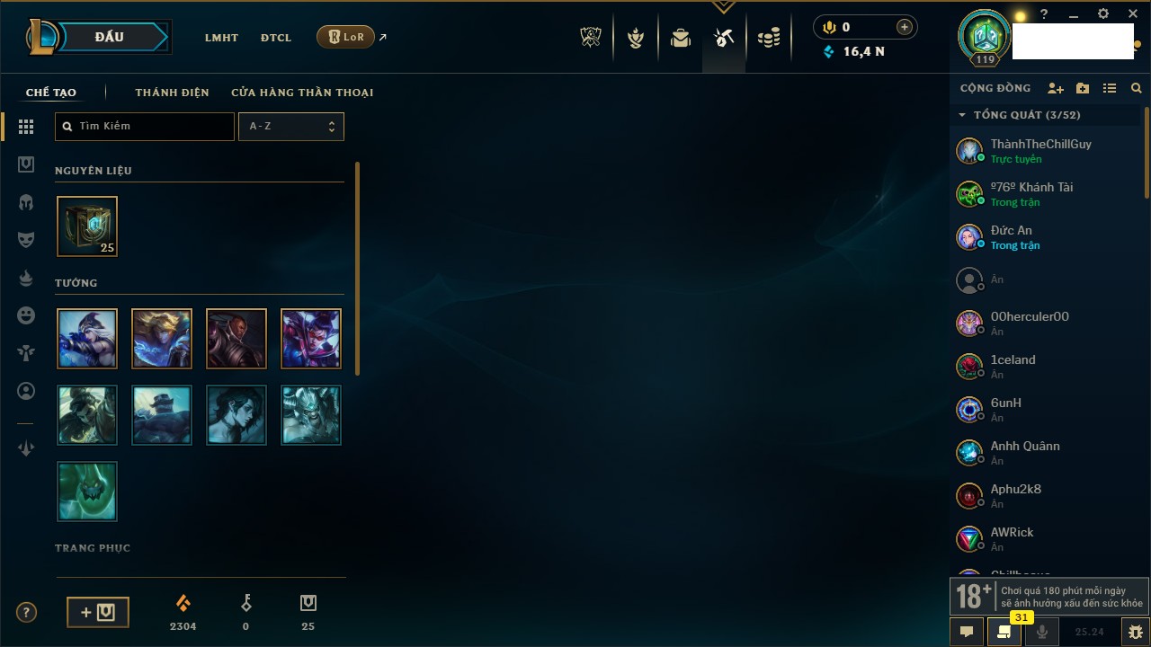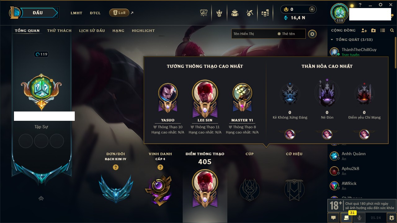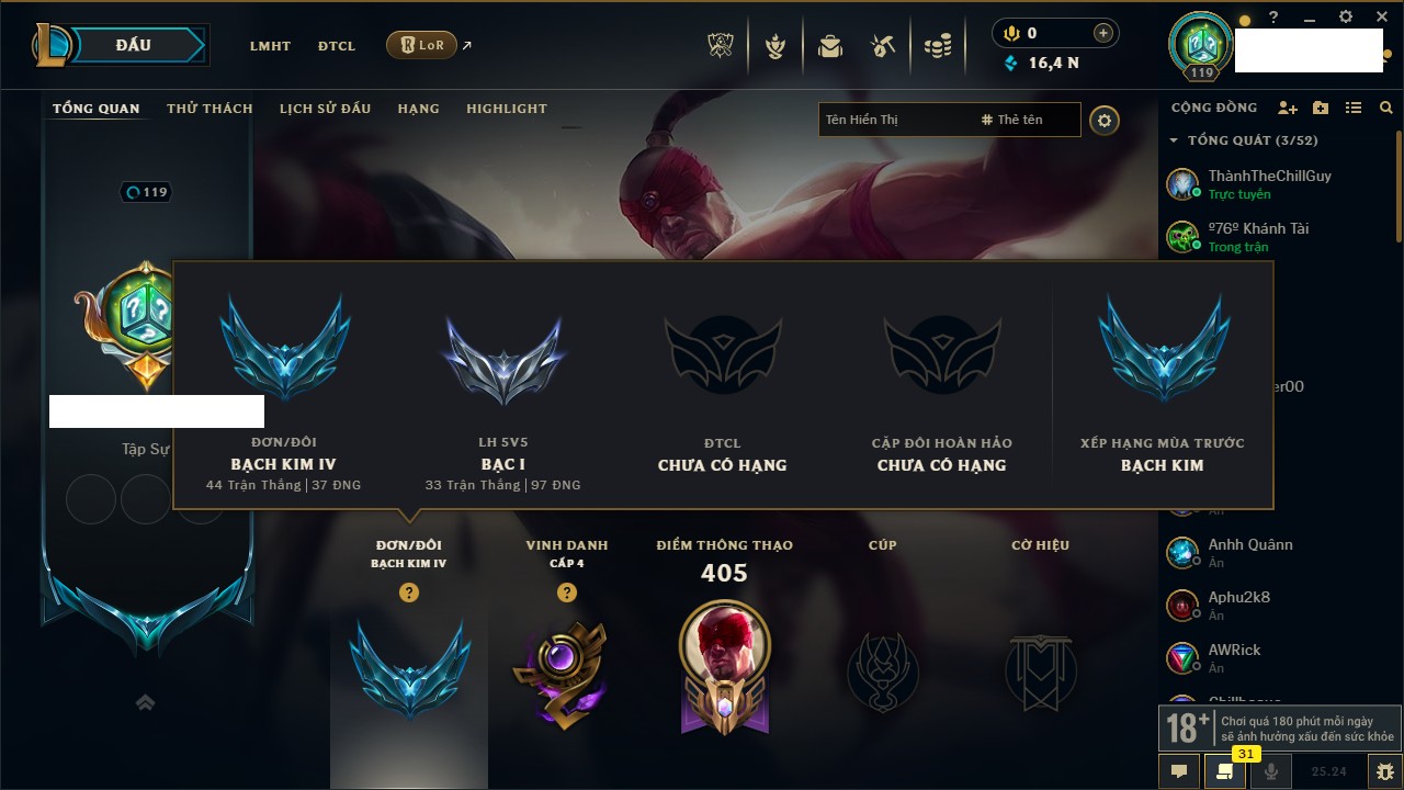 Rank Đơn: Bạch Kim IVKhung: Bạch kimTướng: 151 - Còn 16486 THXTrang Phục: 62Rank ĐTCL: Chưa RankLinh Thú: 12