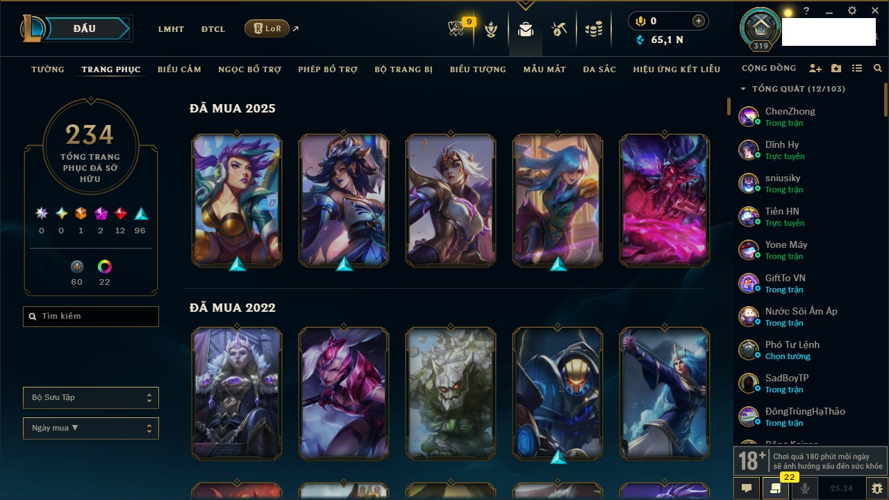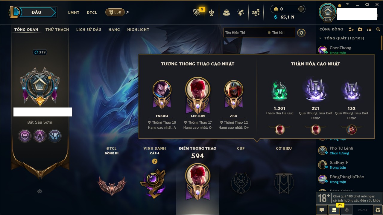 Rank Đơn: Đồng IIKhung: ĐồngTướng: 170 - Còn 66145 THXTrang Phục: 215Rank ĐTCL: Chưa RankLinh Thú: 52