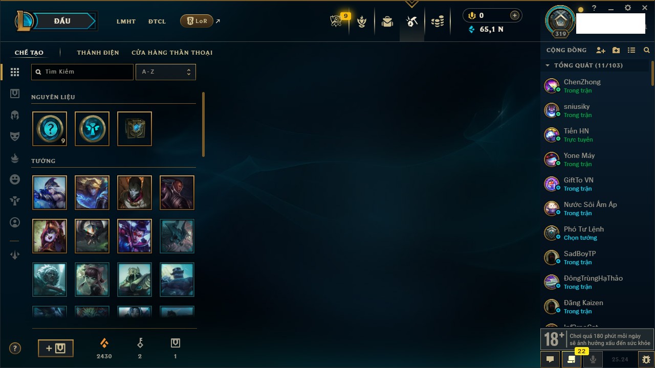 Rank Đơn: Vàng IIIKhung: BạcTướng: 171 - Còn 101359 THXTrang Phục: 88Rank ĐTCL: Kim Cương IVLinh Thú: 200