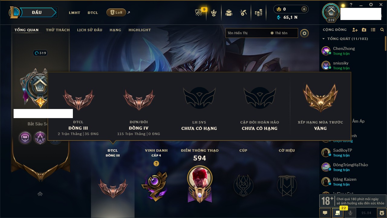 Rank Đơn: Đồng IVKhung: SắtTướng: 163 - Còn 65150 THXTrang Phục: 234Rank ĐTCL: Đồng IIILinh Thú: 39