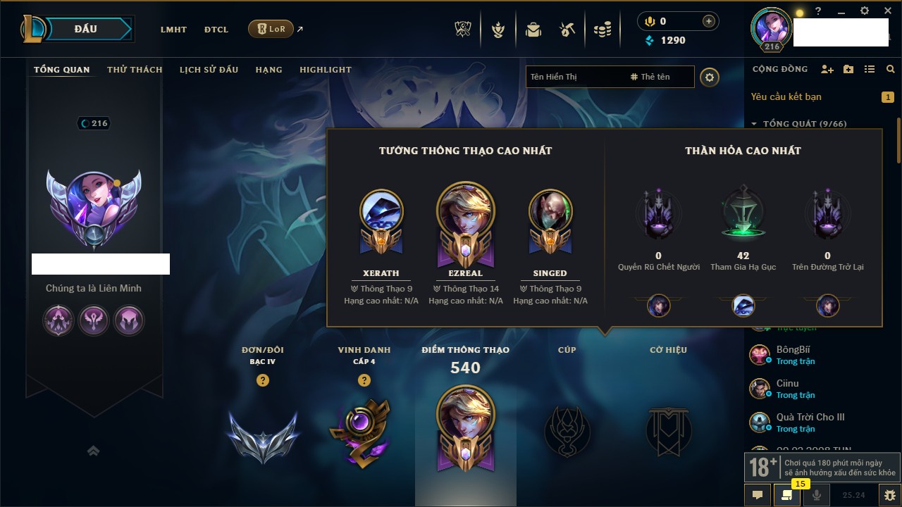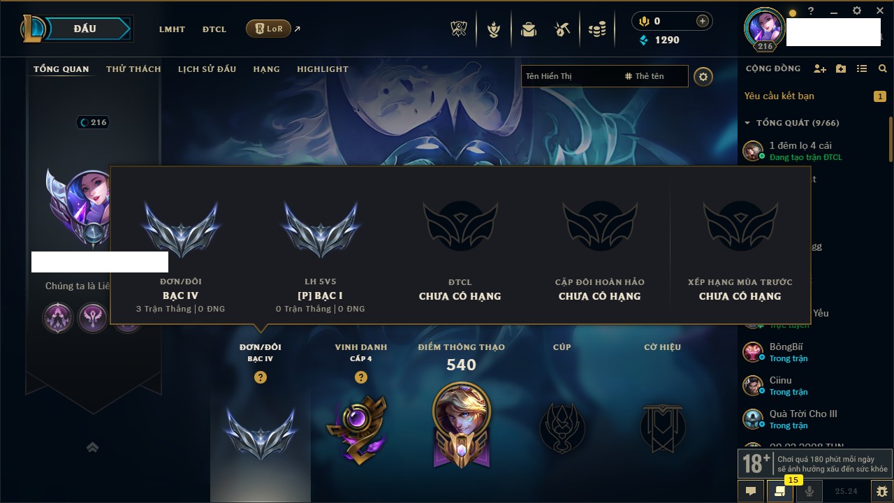 Rank Đơn: Bạc IVKhung: Chưa có khungTướng: 171 - Còn 1290 THXTrang Phục: 145Rank ĐTCL: Chưa RankLinh Thú: 47
