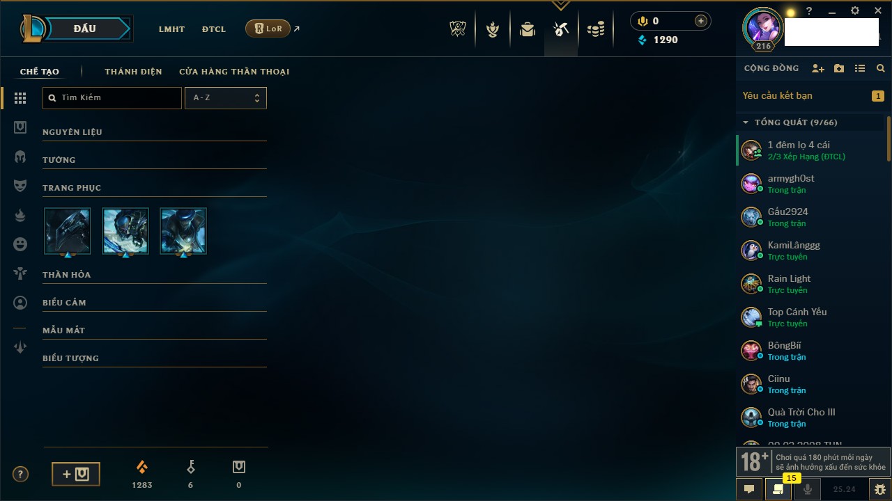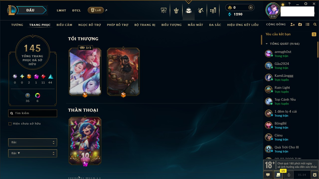 Rank Đơn: Chưa RankKhung: Chưa có khungTướng: 161 - Còn 4964 THXTrang Phục: 151Rank ĐTCL: Chưa RankLinh Thú: 175