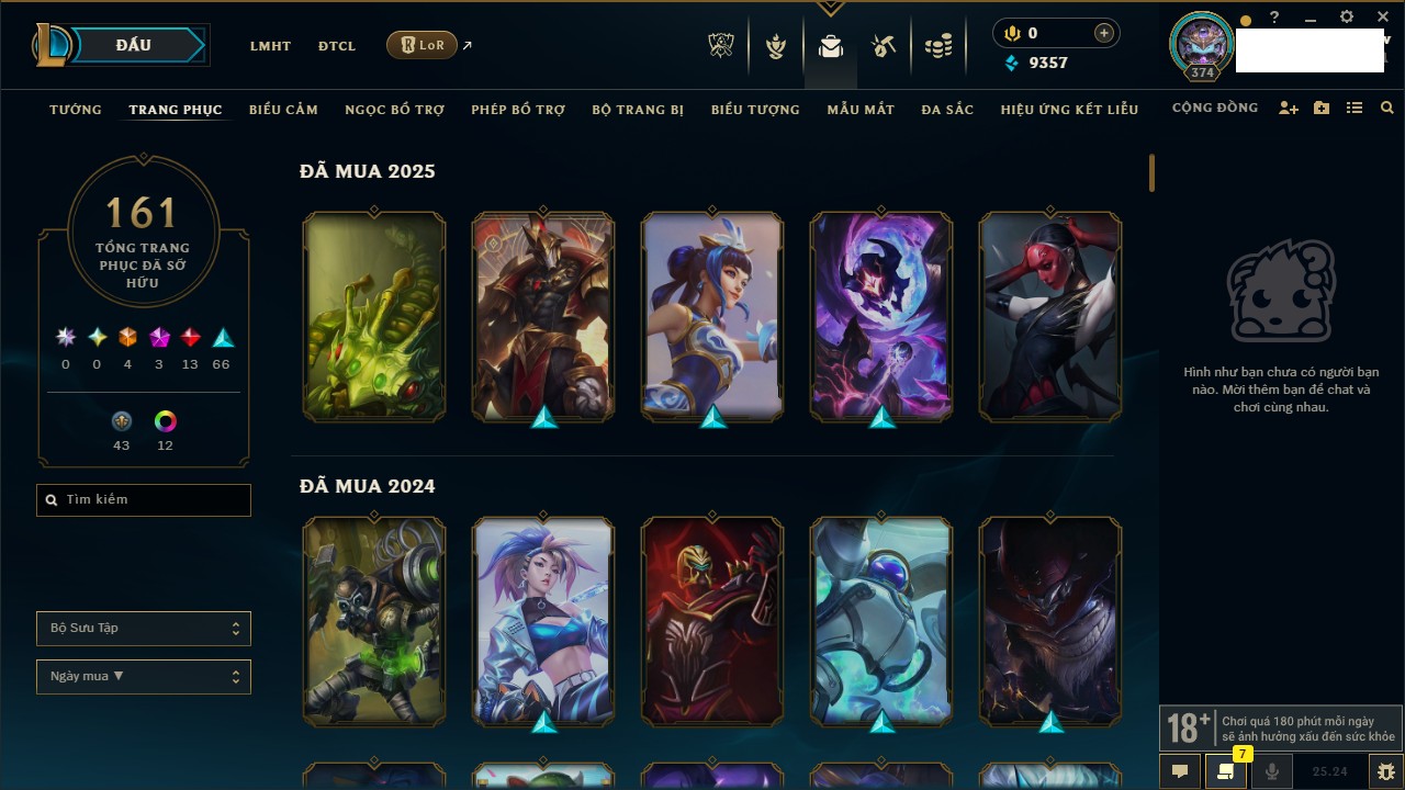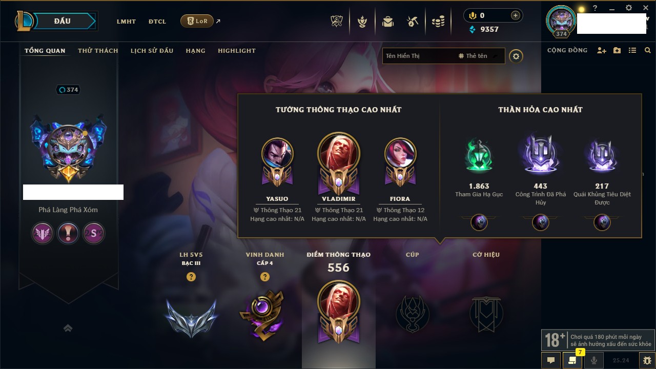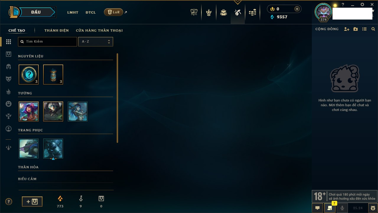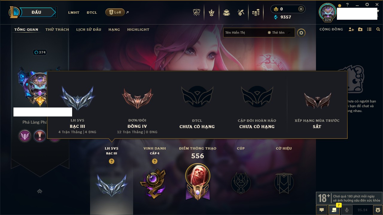 Rank Đơn: Đồng IIKhung: Chưa có khungTướng: 170 - Còn 56487 THXTrang Phục: 90Rank ĐTCL: Chưa RankLinh Thú: 129
