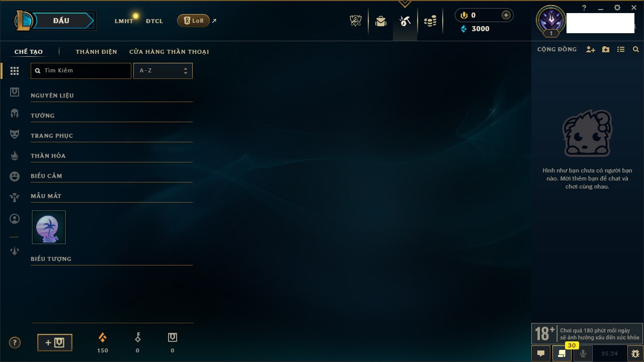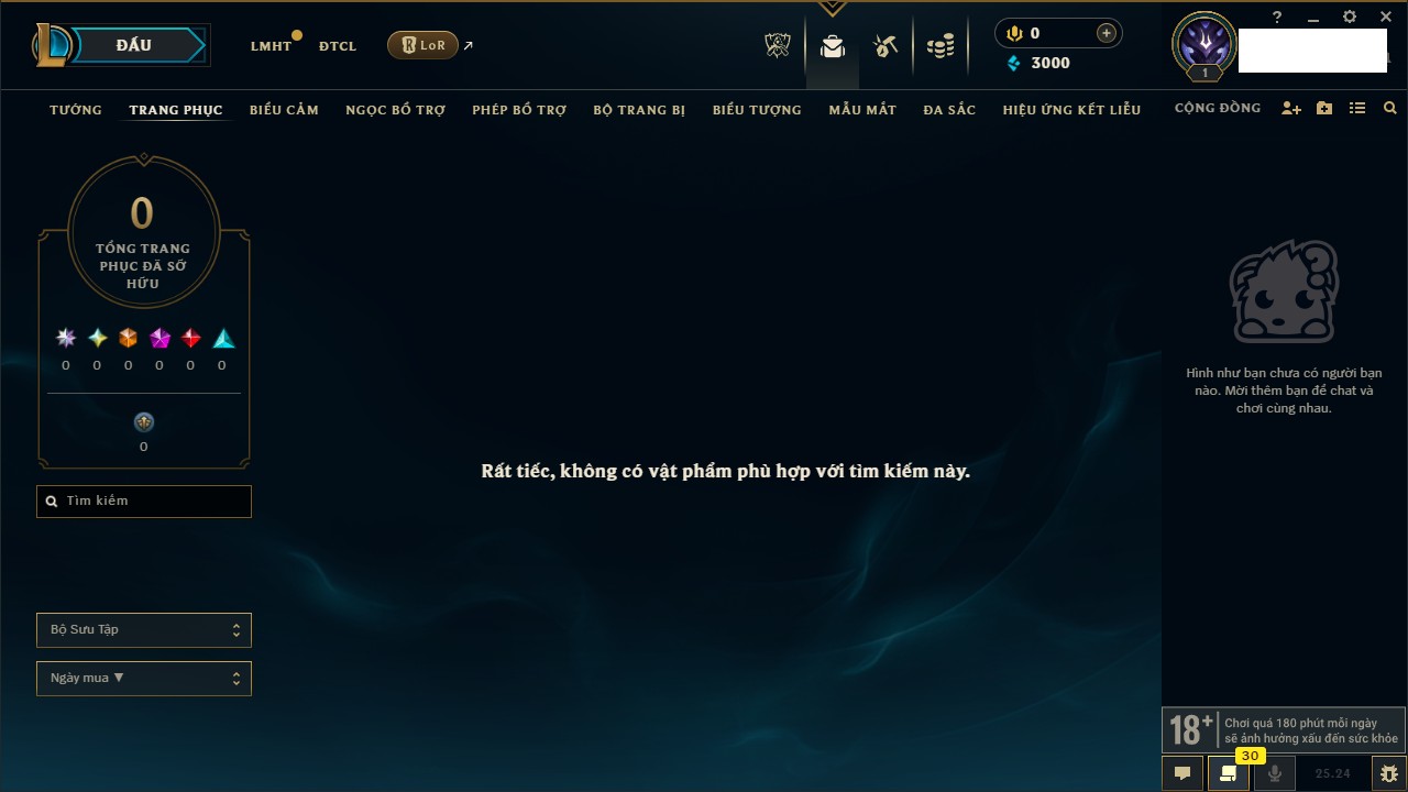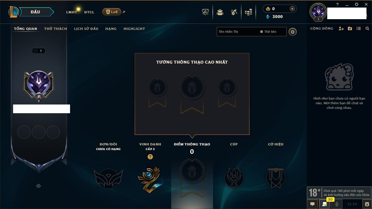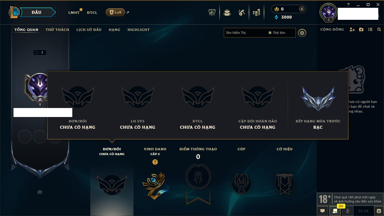 Rank Đơn: Chưa RankKhung: Chưa có khungTướng: 27 - Còn 170 THXTrang Phục: 0Rank ĐTCL: Chưa RankLinh Thú: 33