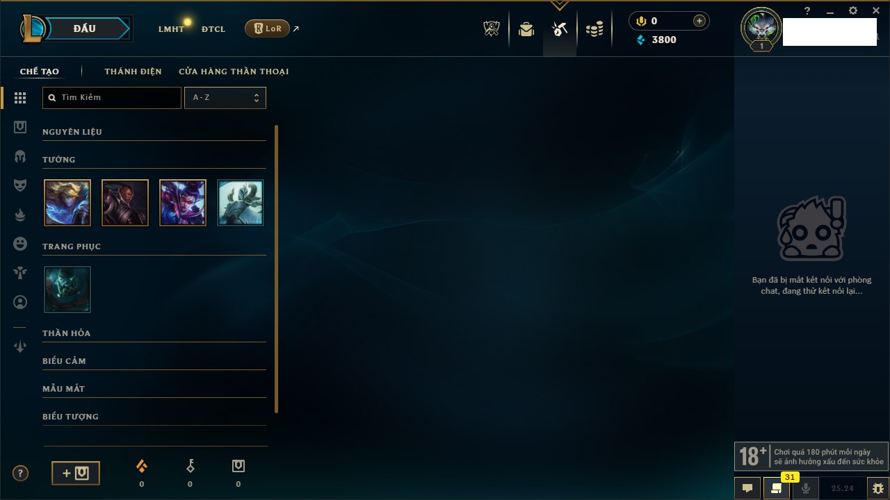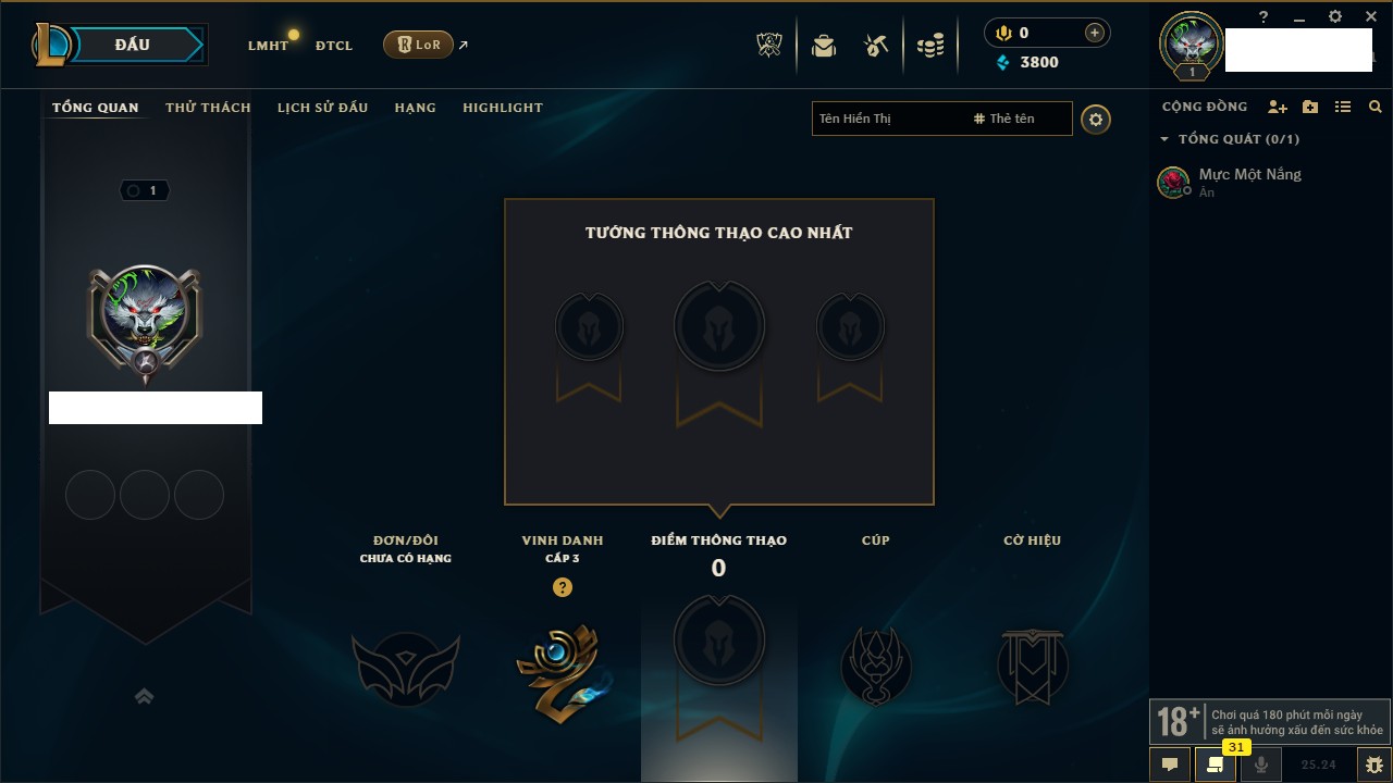 Rank Đơn: Chưa RankKhung: Chưa có khungTướng: 0 - Còn 3800 THXTrang Phục: 0Rank ĐTCL: Chưa RankLinh Thú: 20